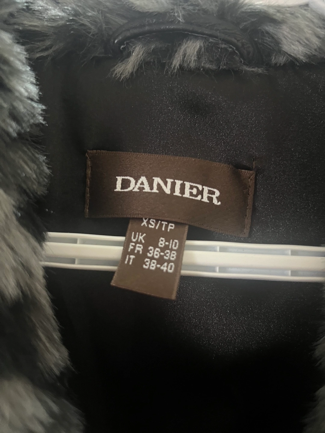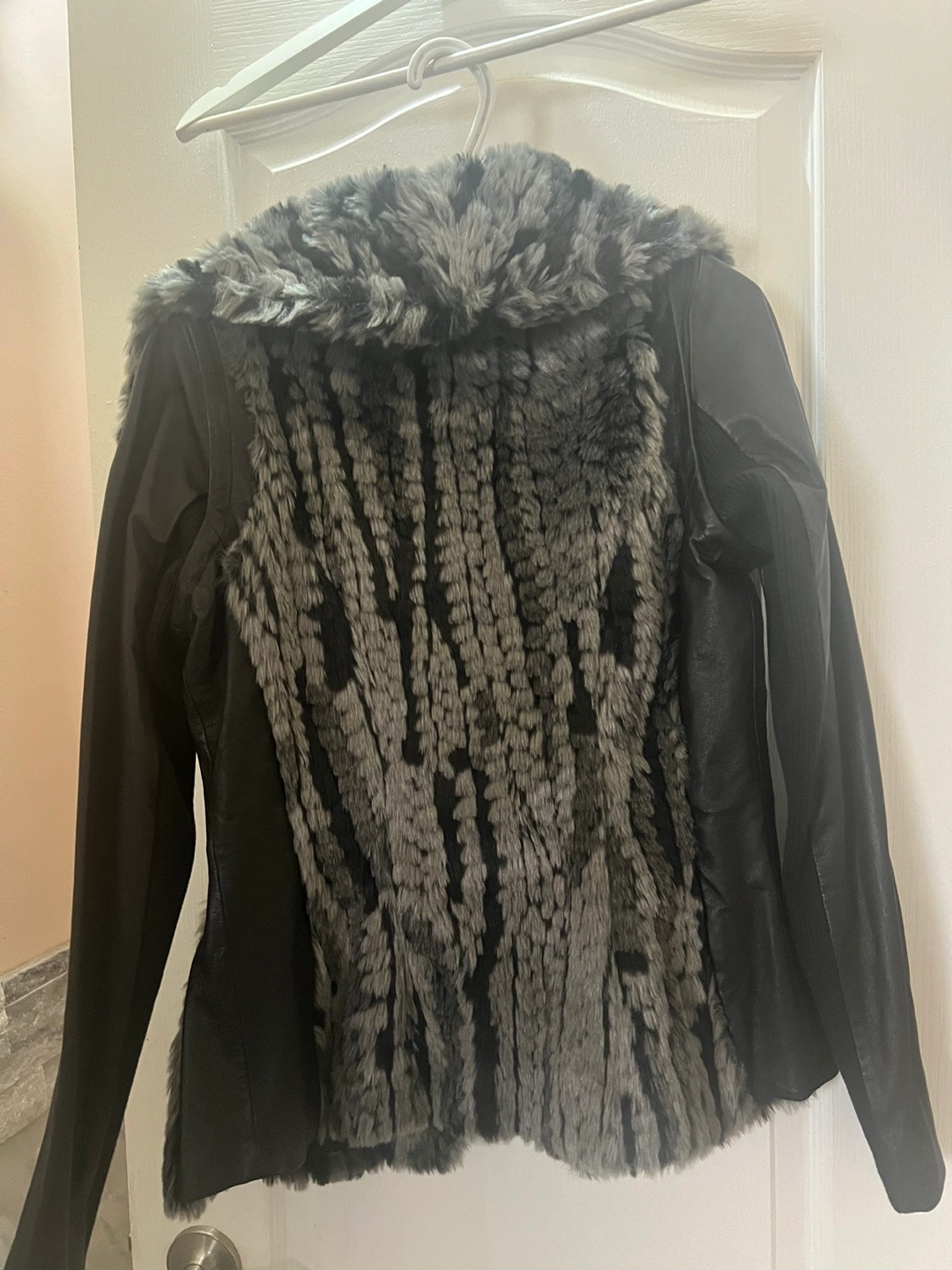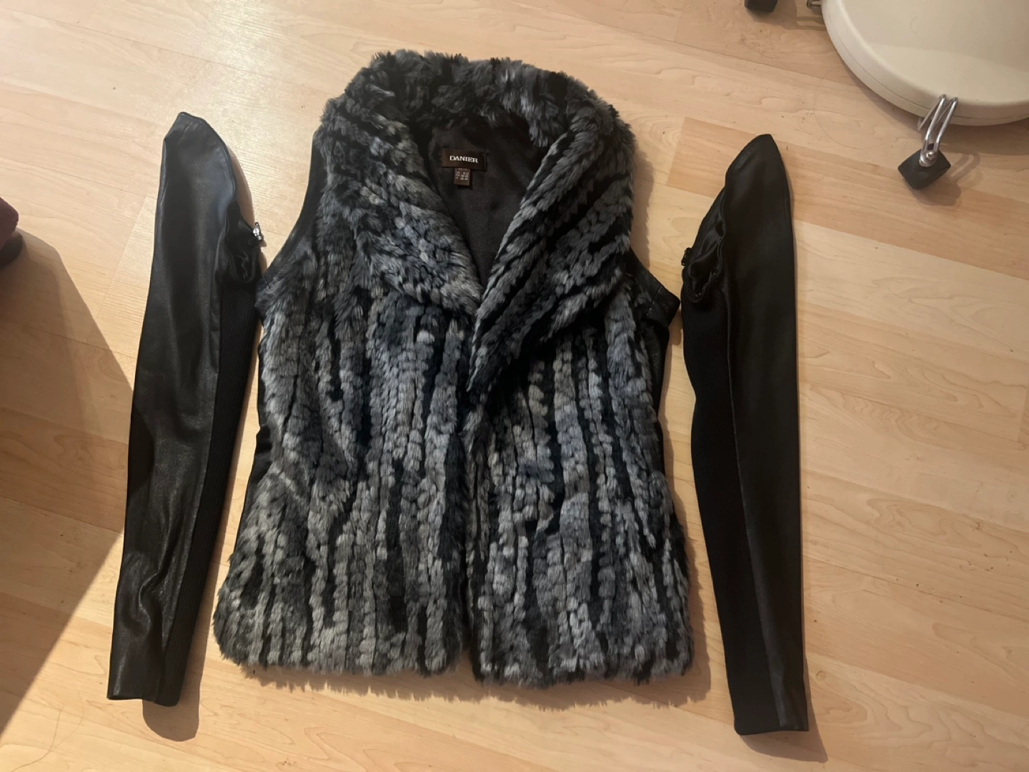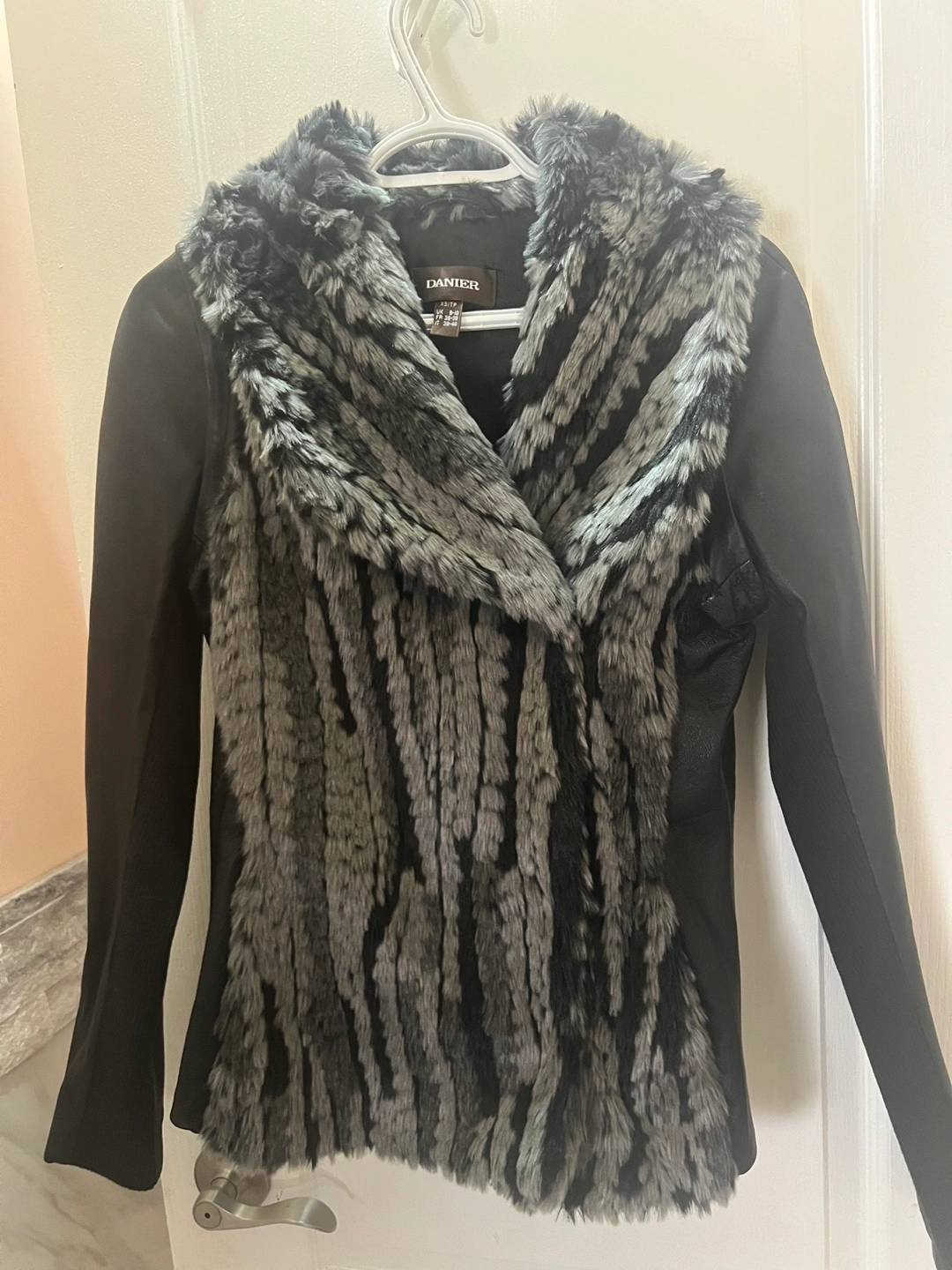 167Danier Black real leather sleeves and grey faux fur jacket. Size XS. Fitting larger, please check measurements in pictures. Detachable sleeves. It can turns into fur vest. Minor flaw on the fur.like new condition. Rare to find now.