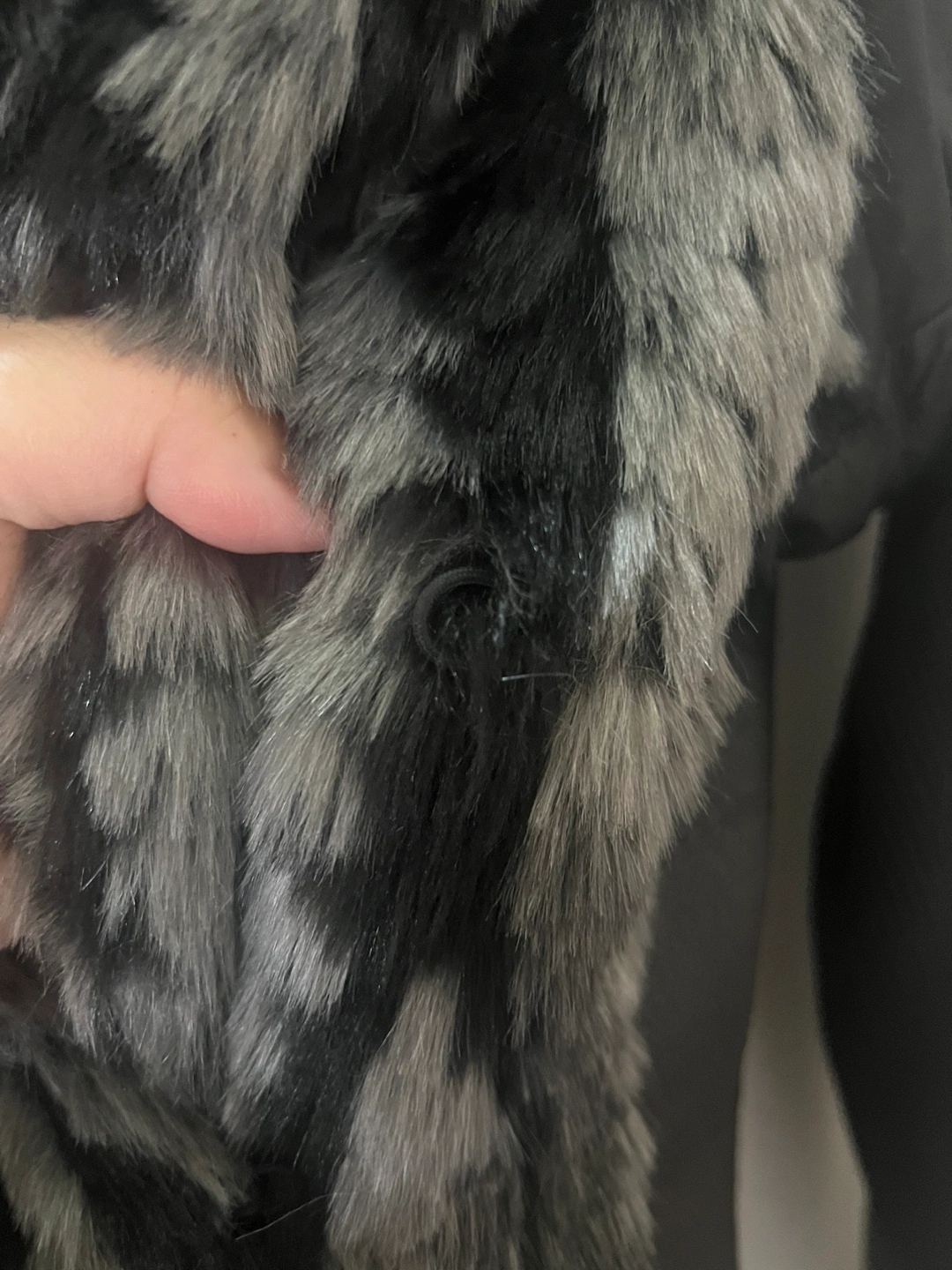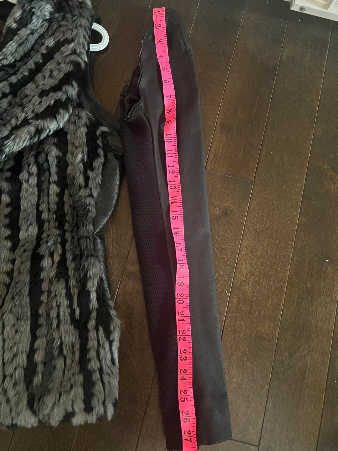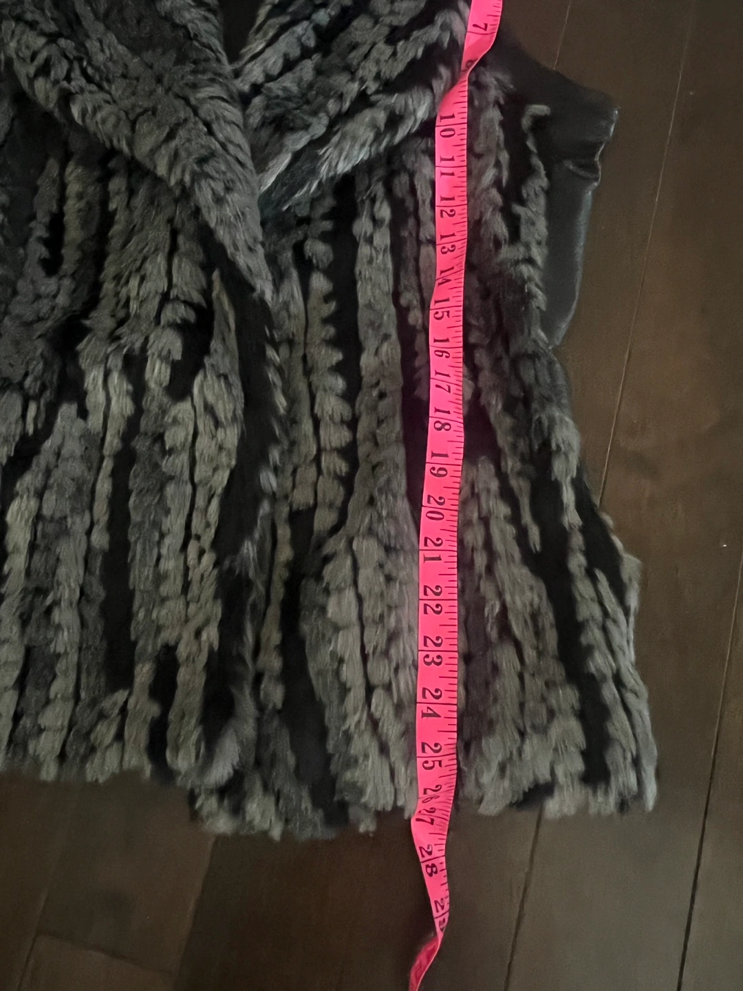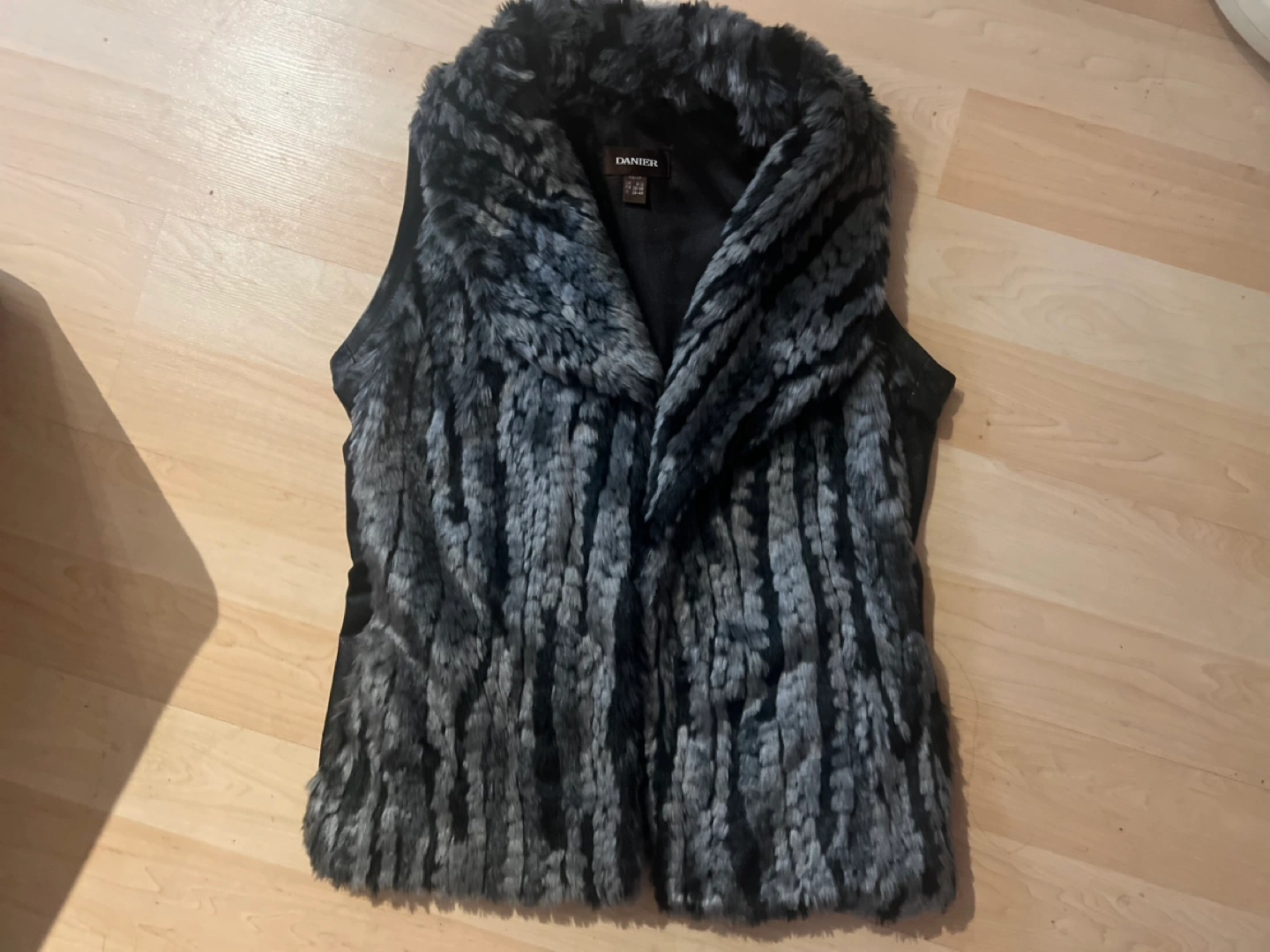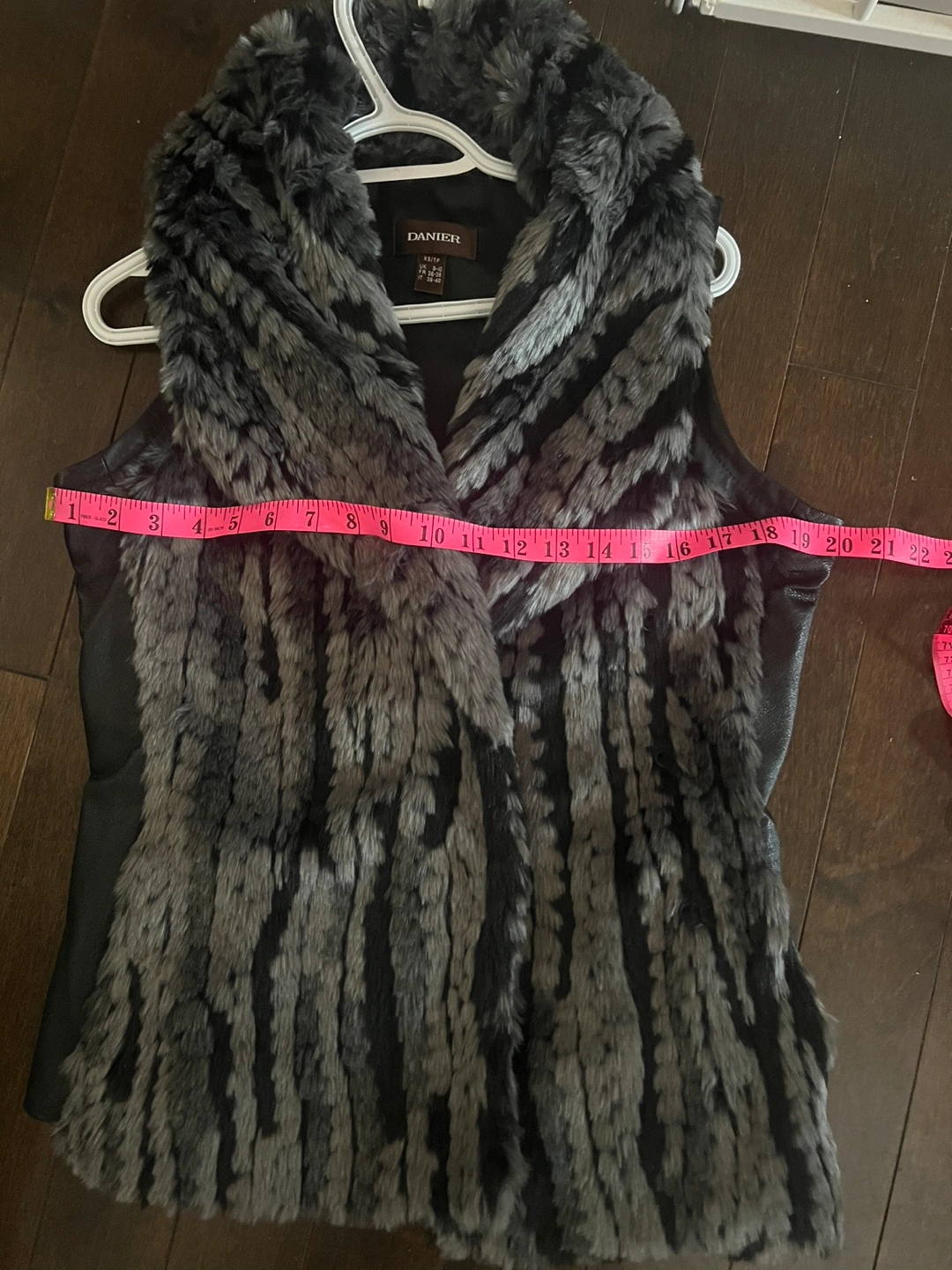 167Danier Black real leather sleeves and grey faux fur jacket. Size XS. Fitting larger, please check measurements in pictures. Detachable sleeves. It can turns into fur vest. Minor flaw on the fur.like new condition. Rare to find now.