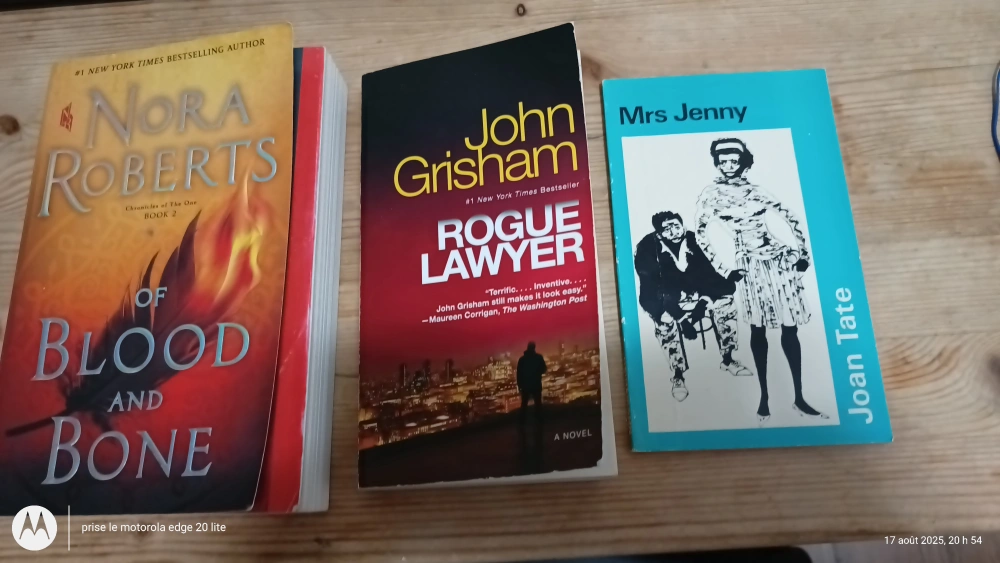 Selling a set of three novels. Includes: 2$ for each one - "Of Blood and Bone" by Nora Roberts (Chronicles of The One, Book 2) - "Rogue Lawyer" by John Grisham - "Mrs Jenny" by Joan Tate