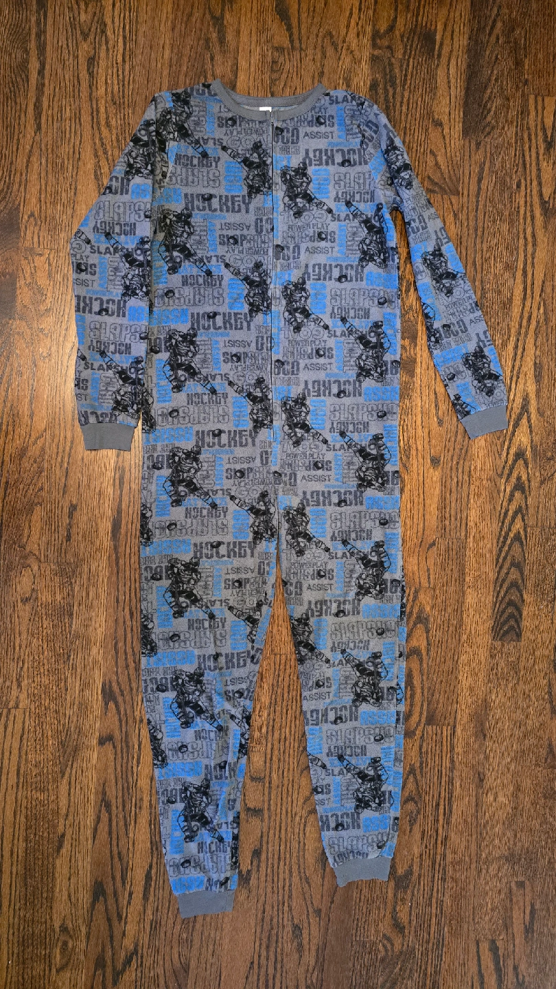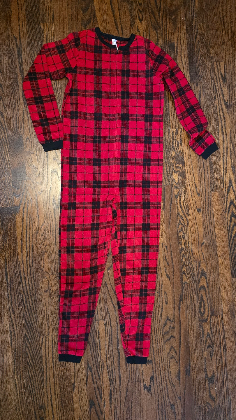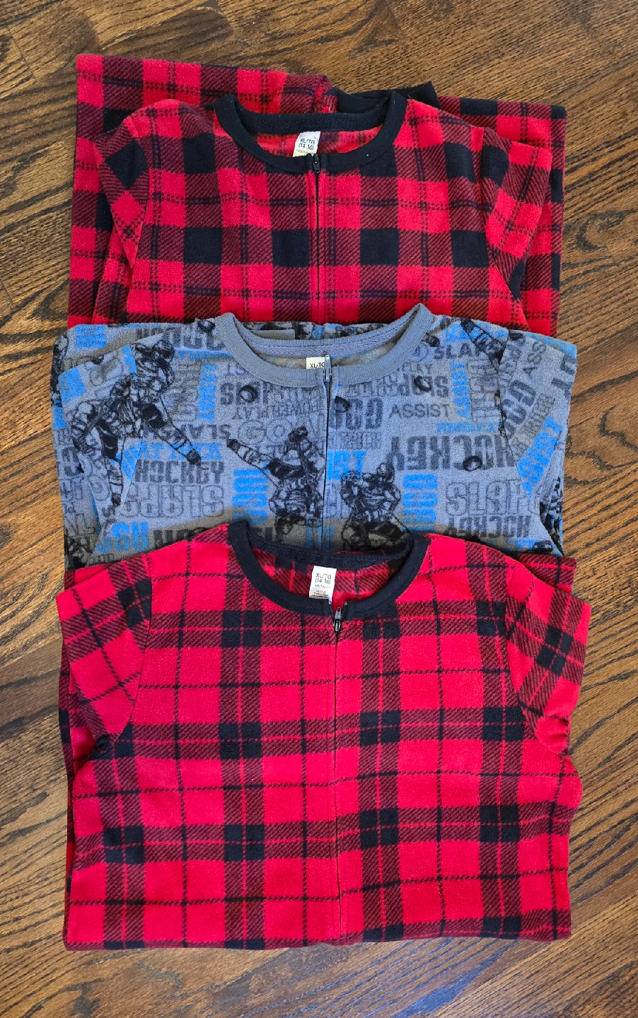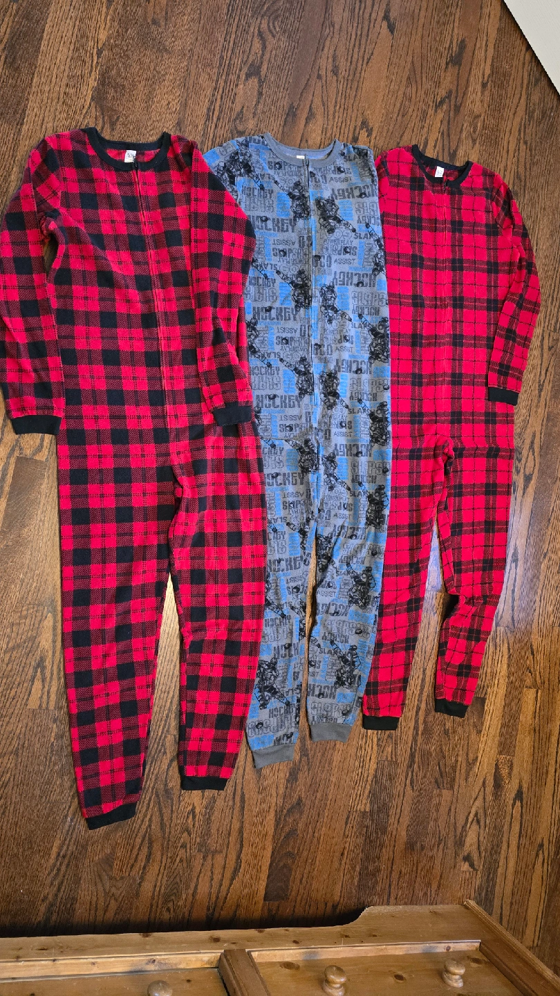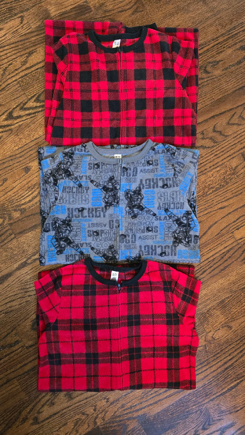 142Selling some cozy onesie pajamas! There are two red and black plaid onesies and one grey and blue hockey-themed onesie. They're all size 14-16Y and in great condition, perfect for keeping your little one warm this winter. As new condition. Fits more a 12-13Y