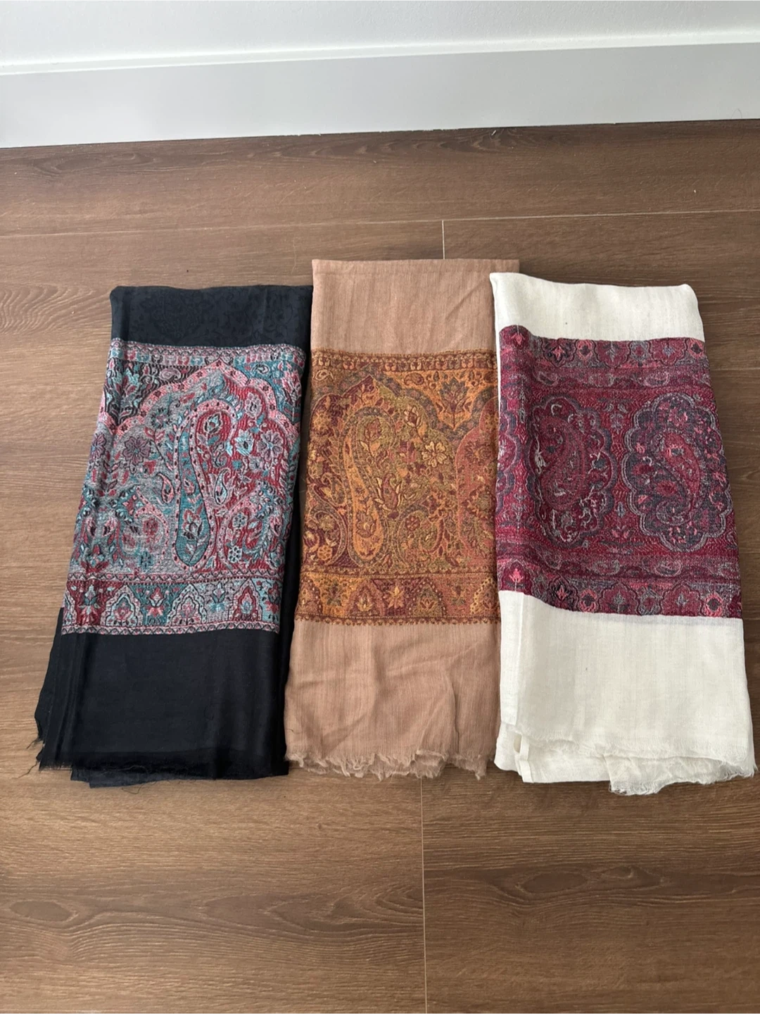10Selling three pashmina stole in excellent condition! They come in cream, black, and beige, all with beautiful detailing. Perfect for adding a touch of elegance to any outfit!