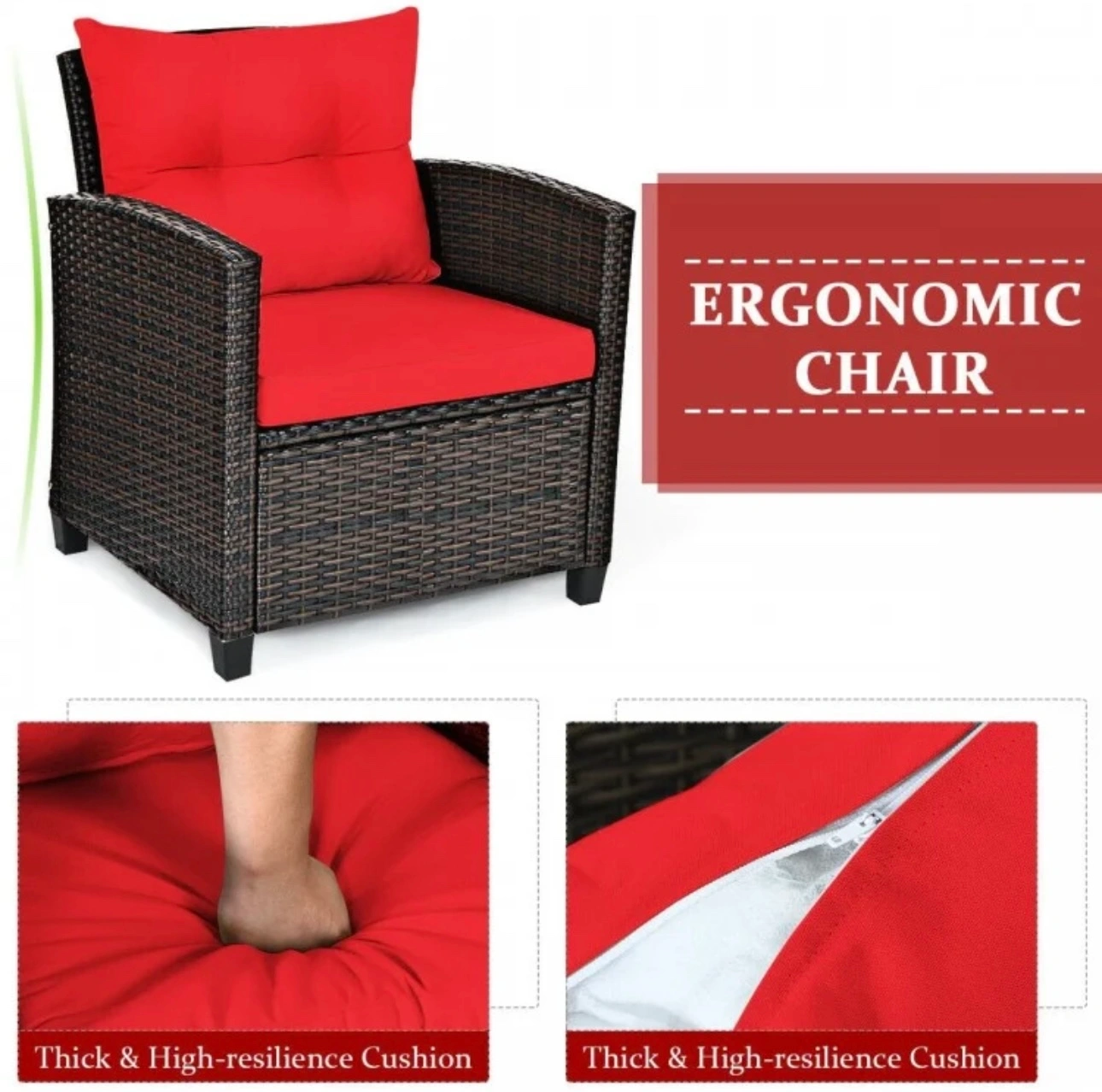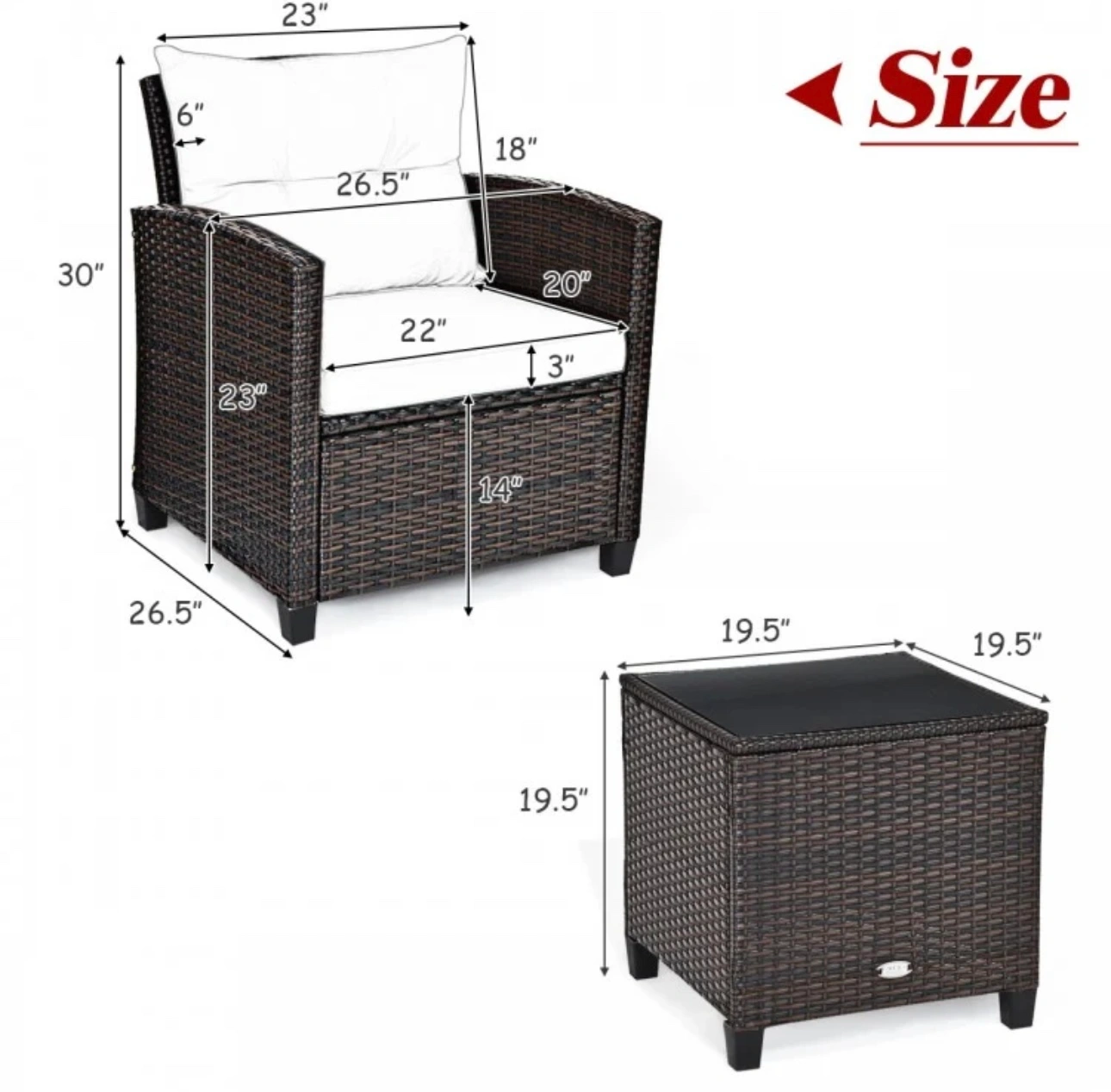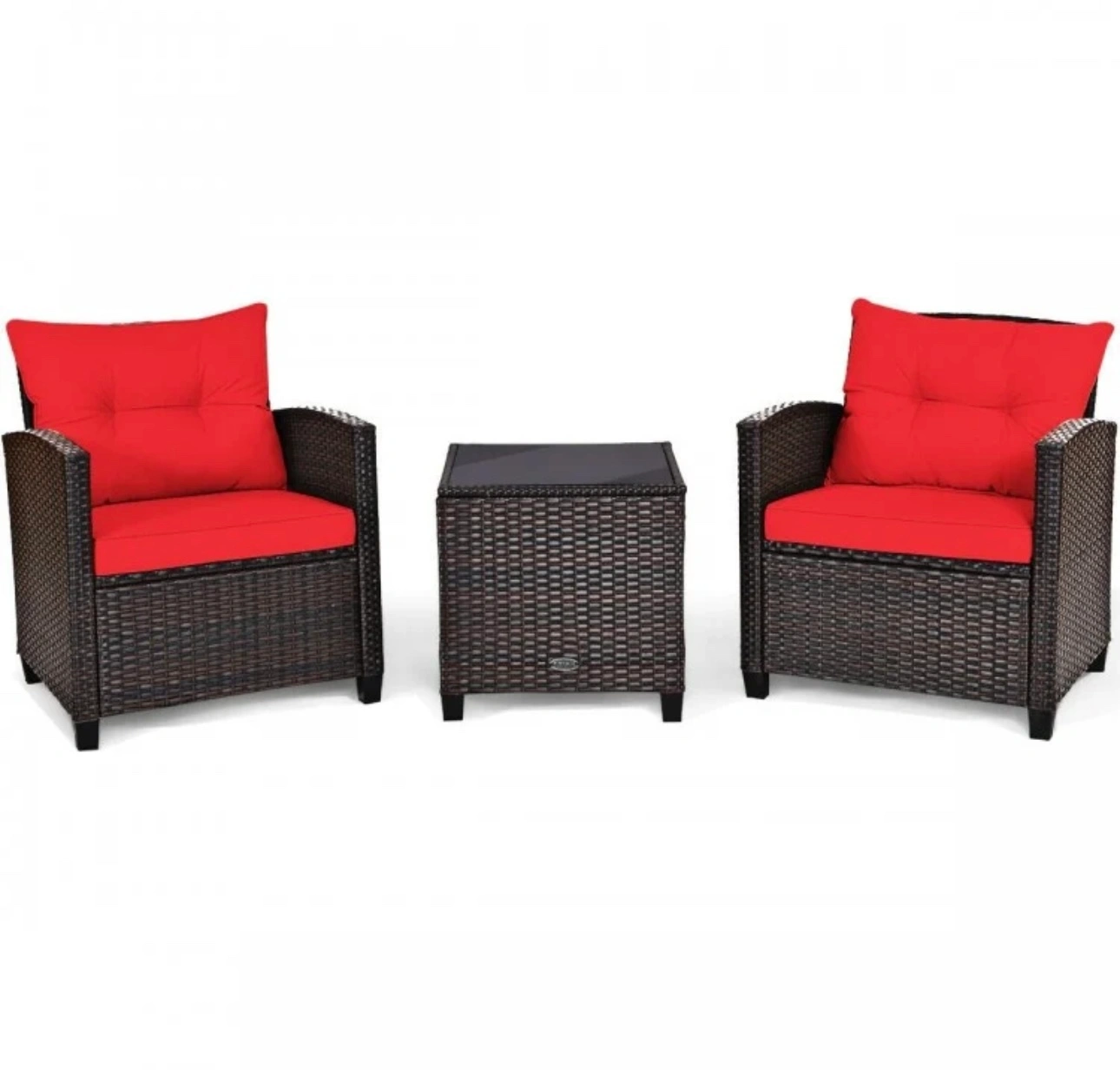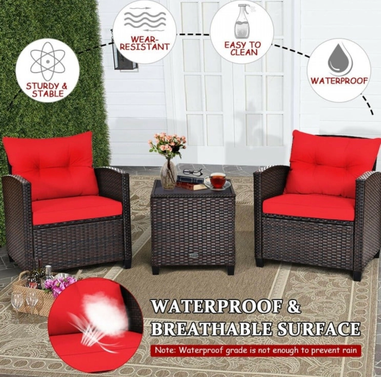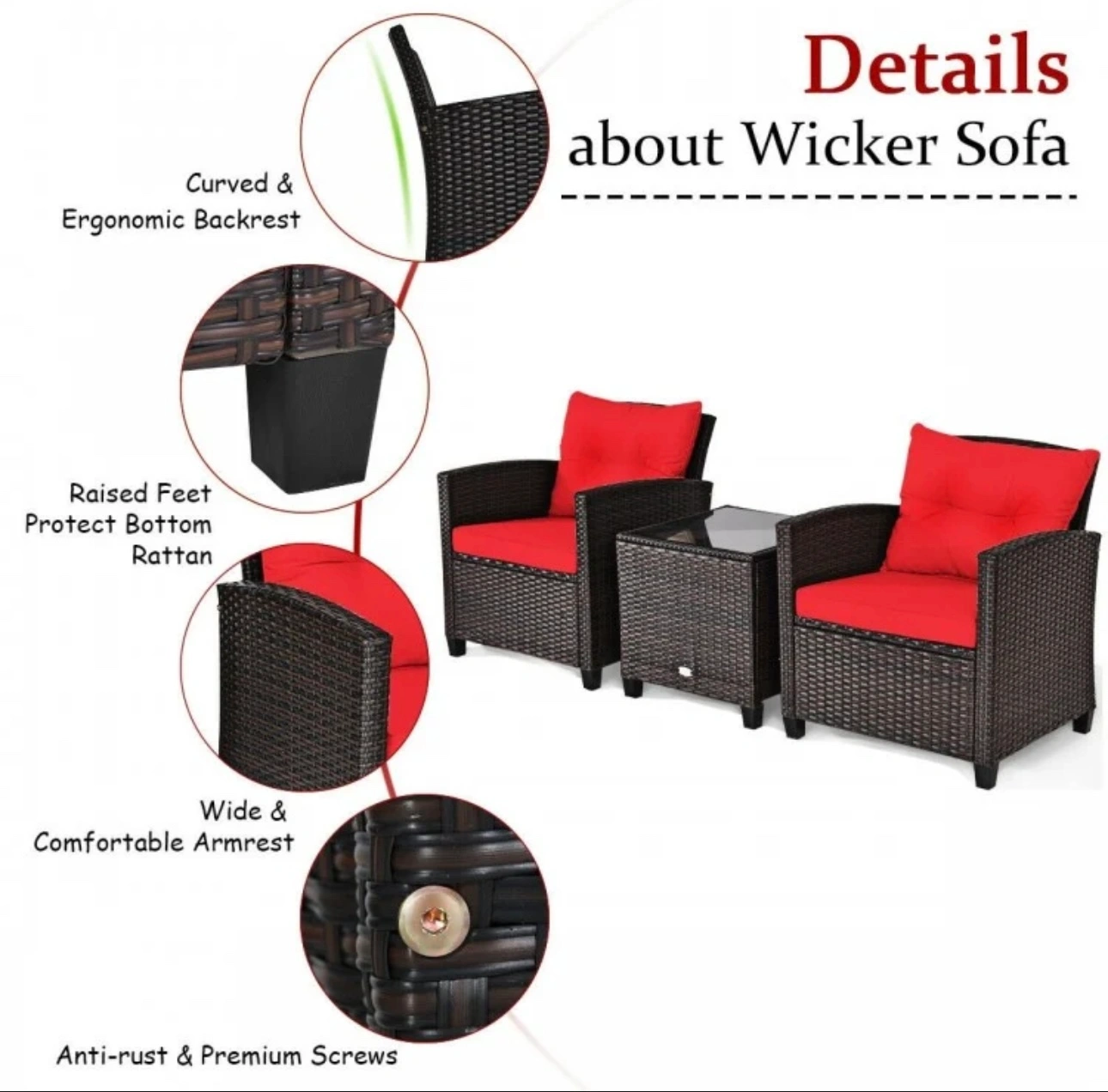 New 3 pcs cushioned Rattan Patio set with Coffee table - Sturdy Steel Frame and Premium Rattan - Rust resistant Steel frame Seat size is approx : 26.5”x26.5”x30 Holds up to 360lbs Coffee table size is approx ; 19.5”19.5”x19.5” Holds up to 70lbs Cushion size approx : 23”x18”x6” Seating cushion size approx : 22”x20”x3” Pick up in Richmond close by Walmart or in East van Grandview highway/boundary area Coffee table glass is a tiny scratch mark shown in the last photo