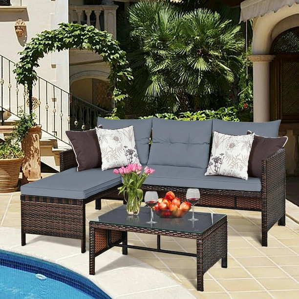 brand New Sealed 💥 first come first serve. Costway 3PCS Patio Wicker Rattan Sofa Set Outdoor Sectional Conversation Set Lawn Garden Wicker patio furniture set. Includes sectional sofa, chaise lounge, and coffee table. Grey cushions. Perfect for outdoor entertaining. #PatioFurniture #WickerSofaSet #OutdoorFurniture #RattanSofa #GardenSet #BalconyFurniture #OutdoorSeating #SectionalSet #LawnFurniture #Costway #3PCSSet #SofaSet #OutdoorLiving #FurnitureSale