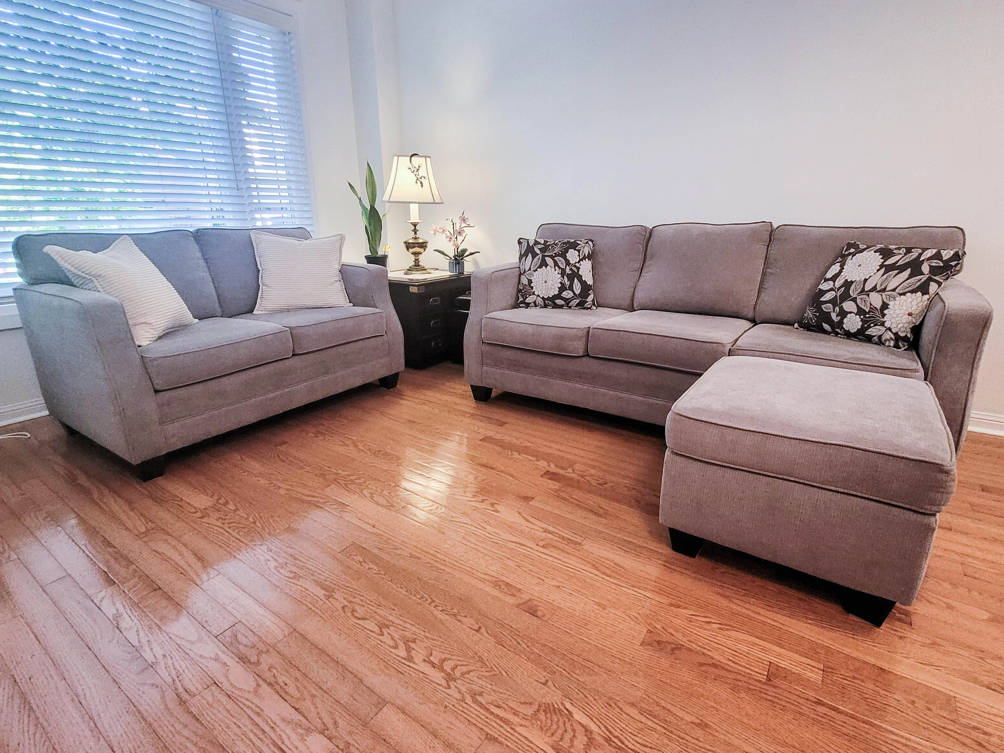Made in Canada 3 piece sofa set (sofa + love seat + ottoman). Neutral colour (taupe). Perfect size for apartment or condo. Like new condition, purchased August 2021. From smoke and pet free home. Asking $700