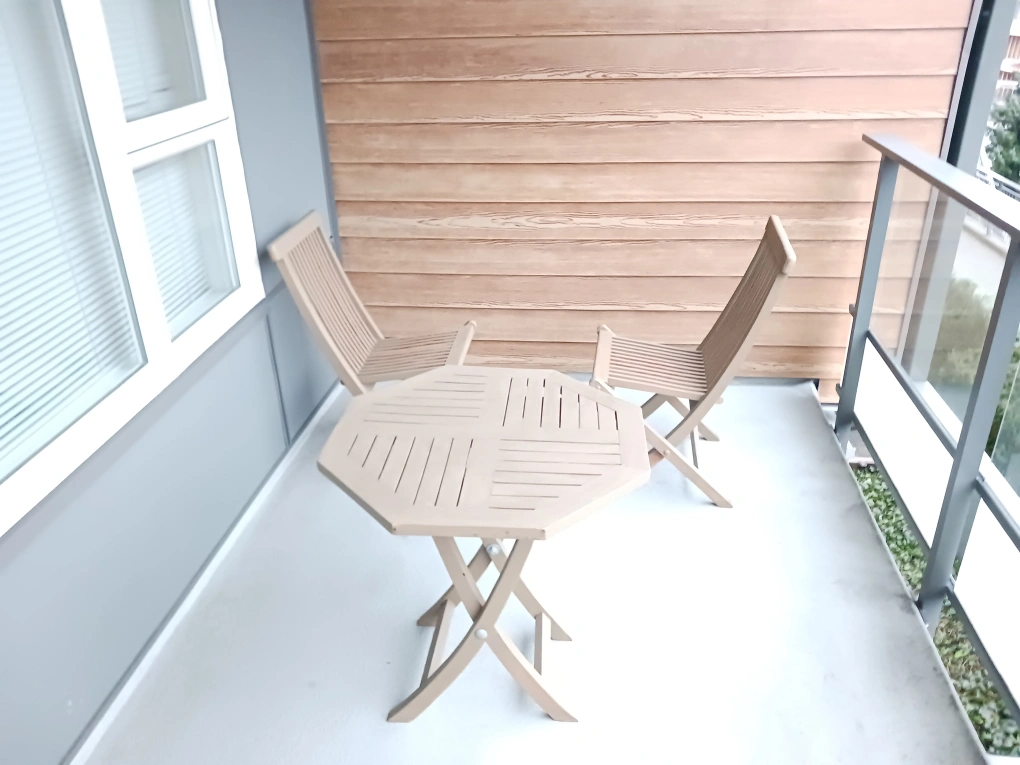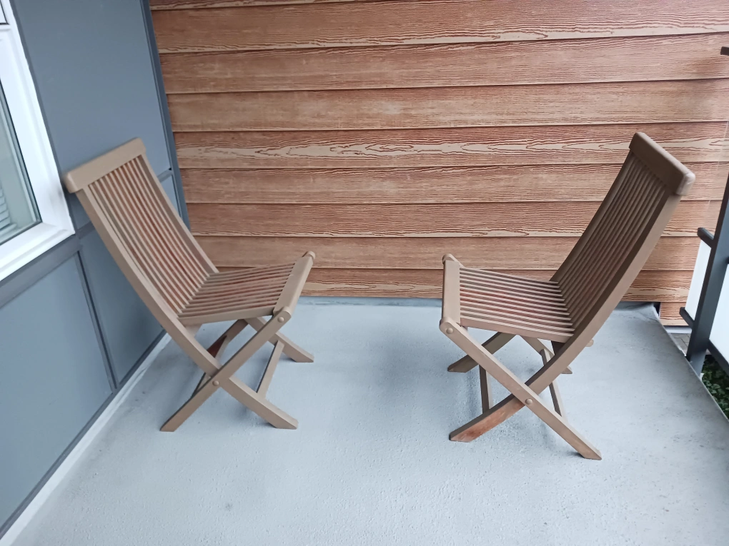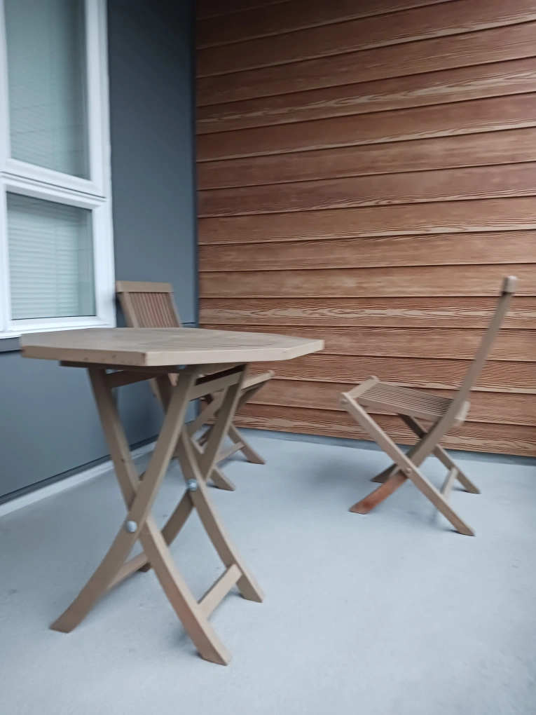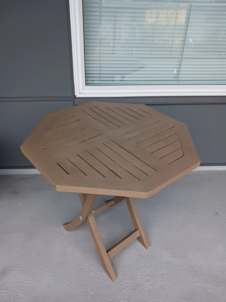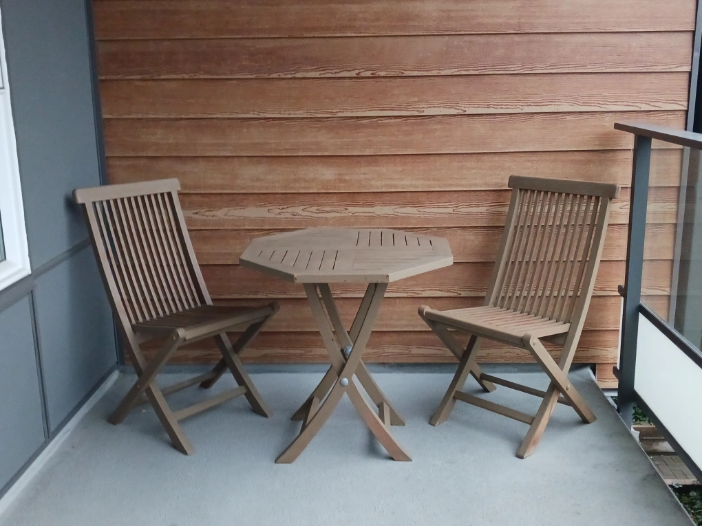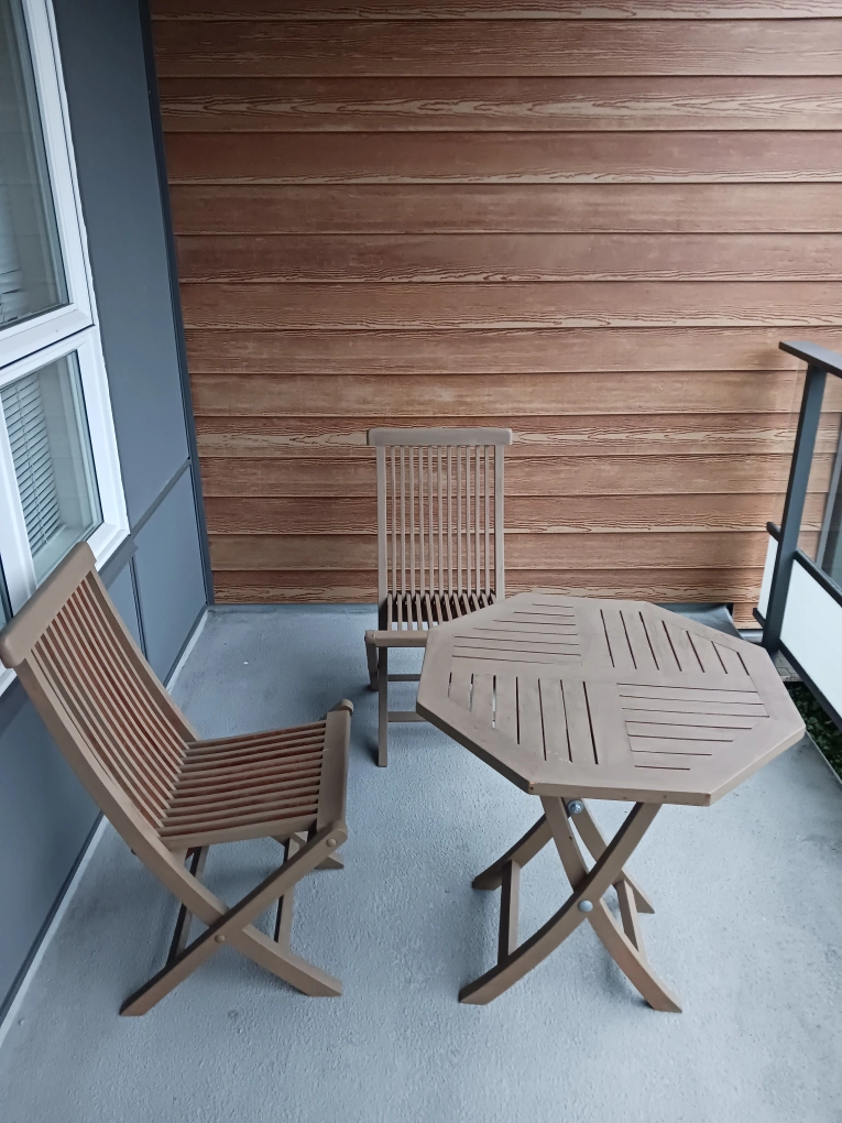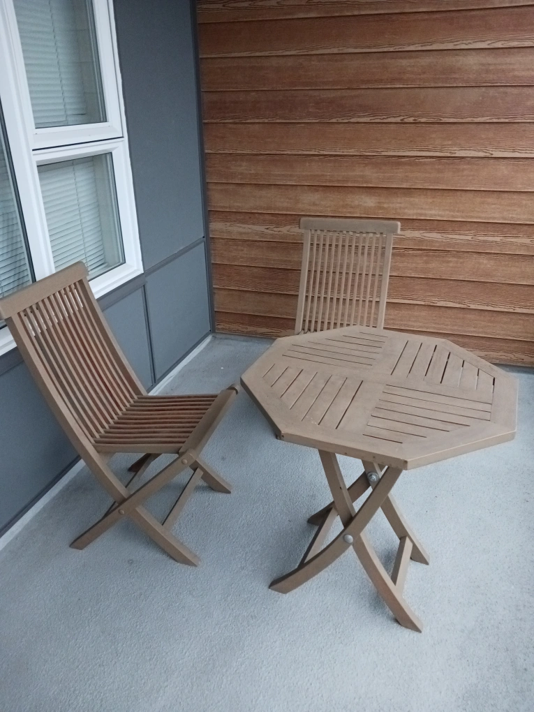 Three-piece teakwood patio set. Octagonal folding table. Two folding chairs. Brown colour. Perfect for small patio or balcony. they can be left outside the whole of winter. https://www.wayfair.ca/outdoor/pdp/highland-dunes-sisler-4-piece-teak-dining-set-c001850718.html