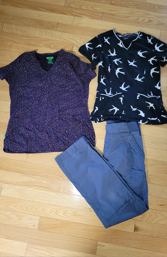 70Here's a set of quality scrub tops and pants! The set includes two scrub tops, one purple and one black with a bird pattern, and a pair of blue scrub pants, all in Size Small. The pants and purple top are Healrh Peo Brand. They have spandex contents as well. listing price is for all 3 pieces