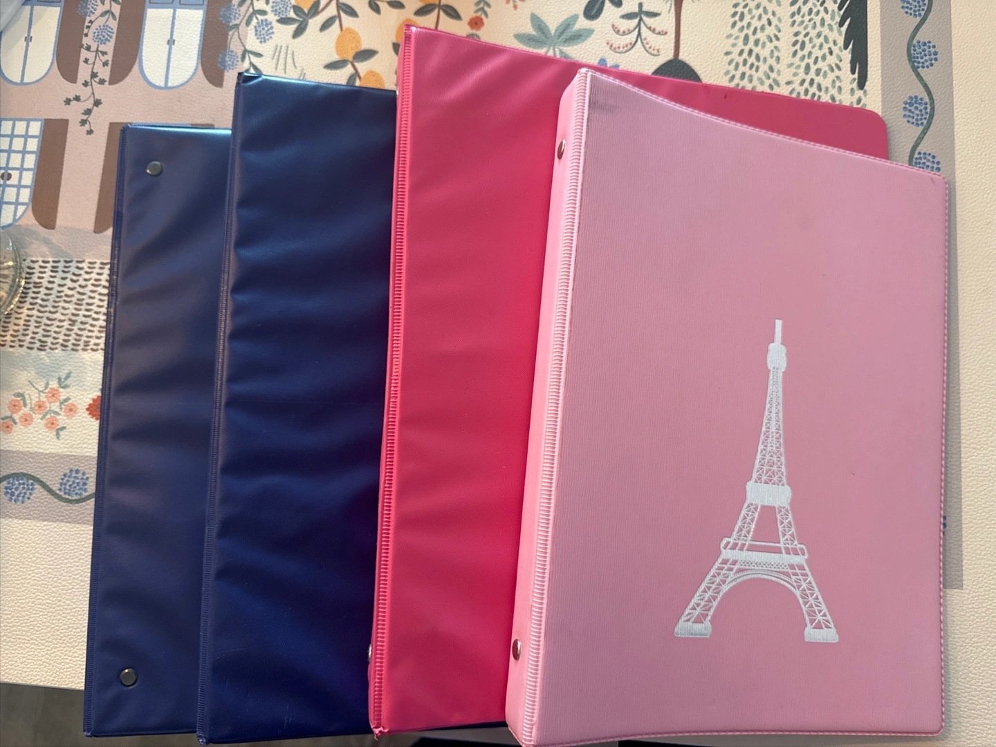 Selling some gently used three-ring binders! There are two blue ones and two pink ones. One of the pink binders has an Eiffel Tower design on it. They're perfect for school, work, or organizing your documents at home