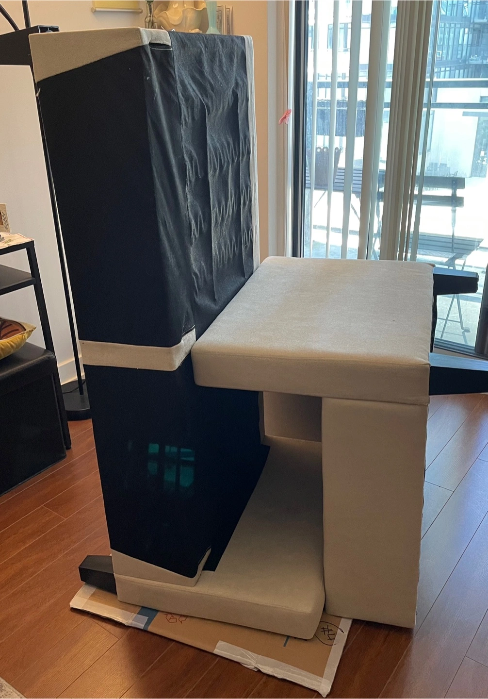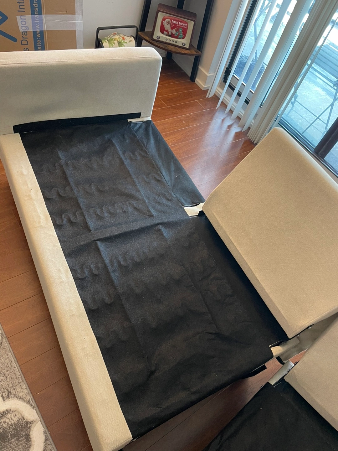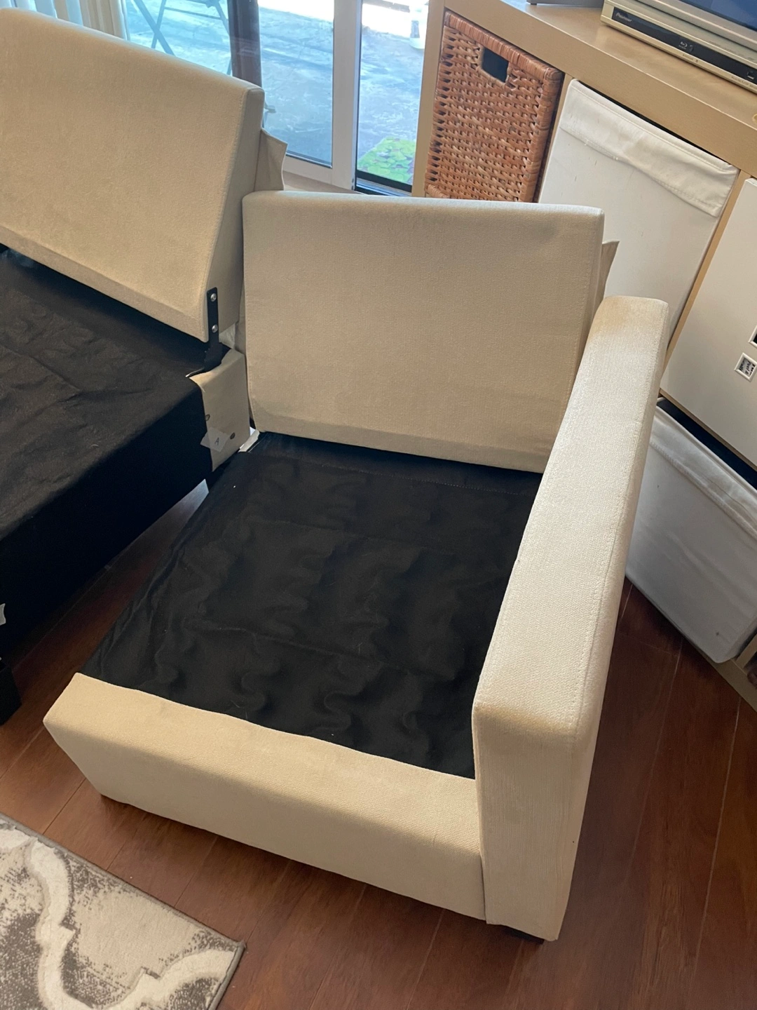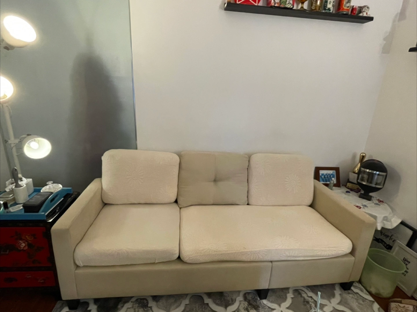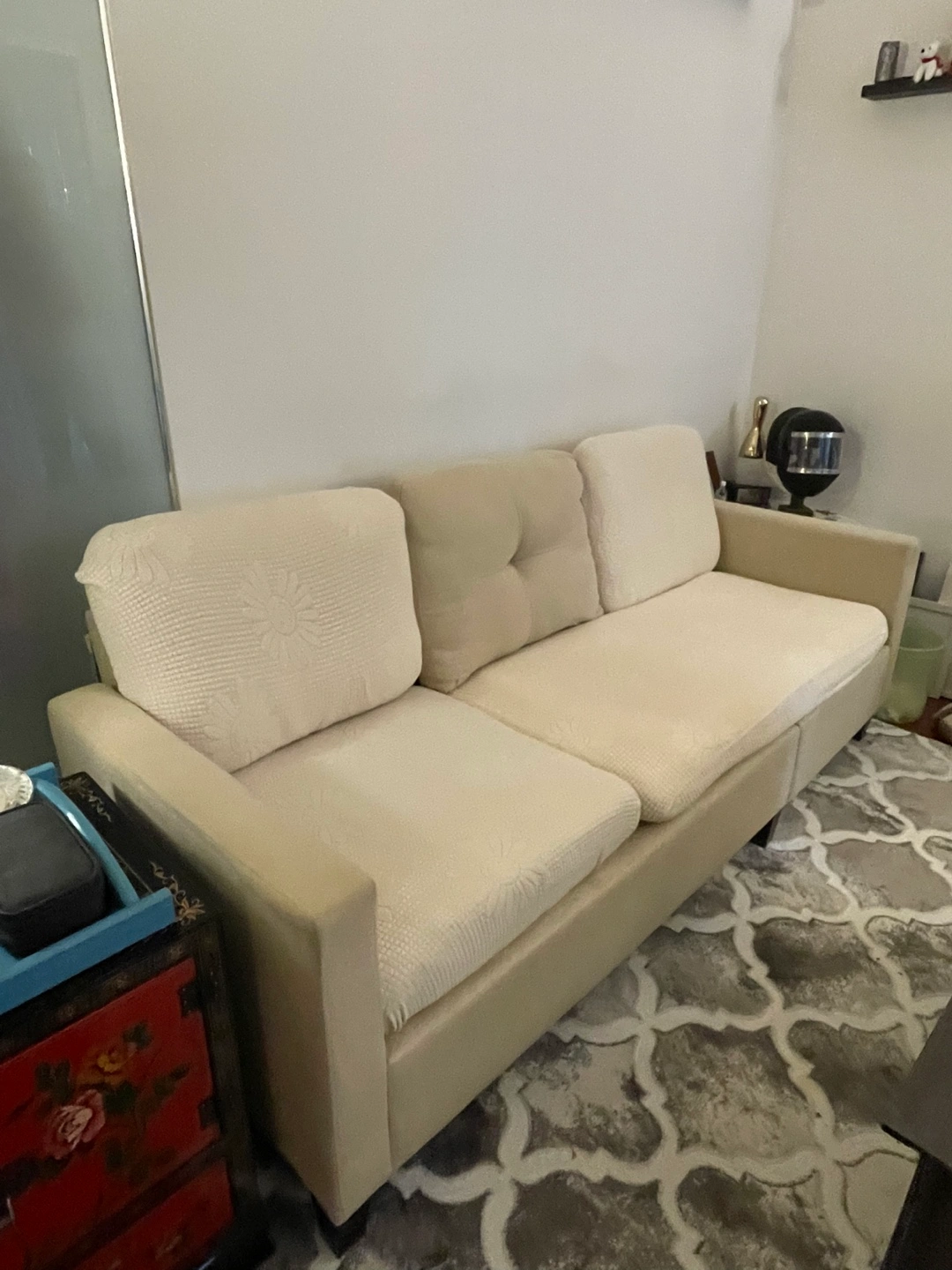 23This is a comfortable 3-seats sofa, perfect for a living room or den. It's in fair condition. The middle back sofa is the features a neutral color (FYI) and will have a nice beige colored with sunshine pattern cover along with the rest of the sofa. Please note that this is a used item. * Has been disassembled into 2 sofa plus several seats pieces. Easy to transport!