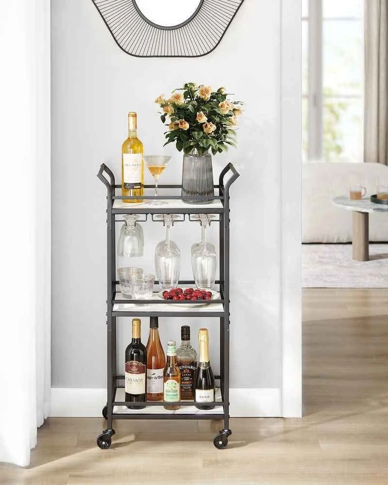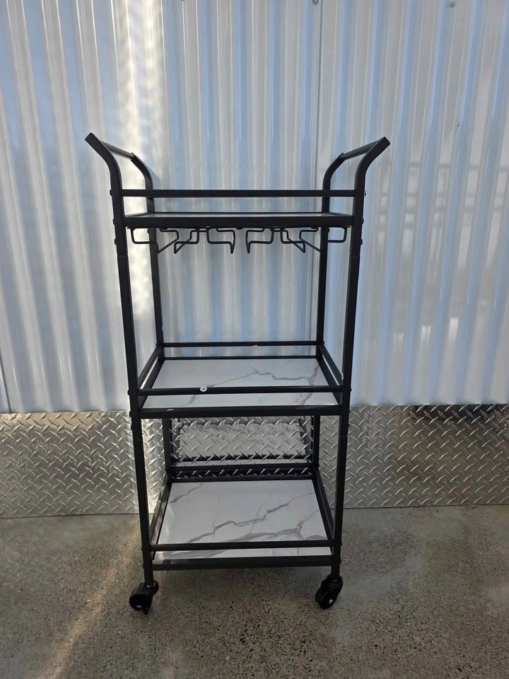 Sleek and functional, this VASAGLE Small Bar Cart is the perfect addition to any kitchen, dining room, or home bar setup. With three marble-style glass shelves and a removable wine glass rack, it combines modern design with practical storage. Dimensions: 11.8"D × 18.4"W × 36.2"H 3-Tier design for bottles, glasses, or décor Removable wine glass rack – fits multiple stemware types Smooth-rolling caster wheels for easy movement Sturdy steel frame with elegant marble-look shelves Curved ergonomic handles for easy mobility Load capacity: 22 lbs (10 kg) per shelf Ideal for entertaining, kitchen organization, or staging Condition: Brand new, pulled from a liquidation pallet