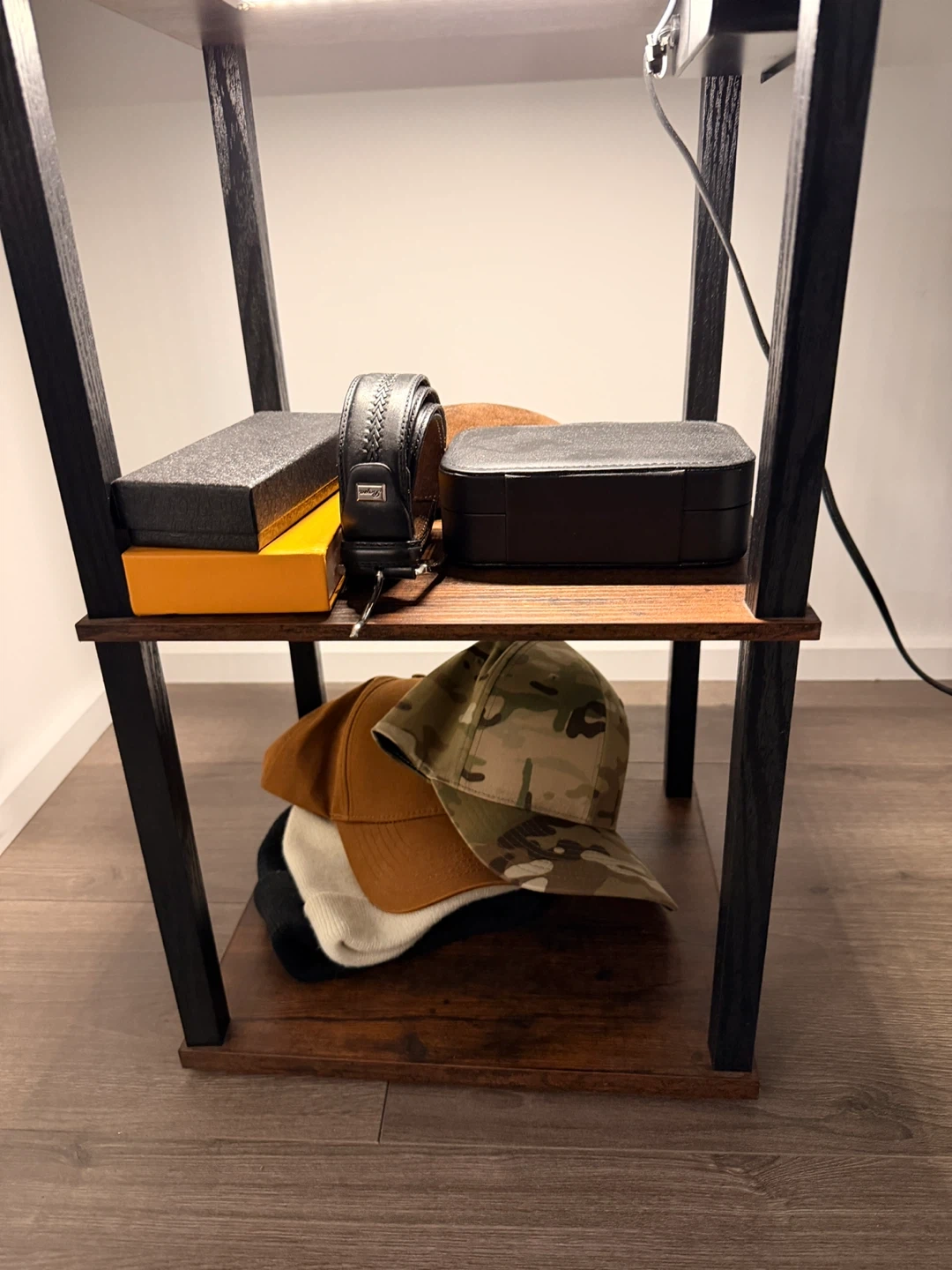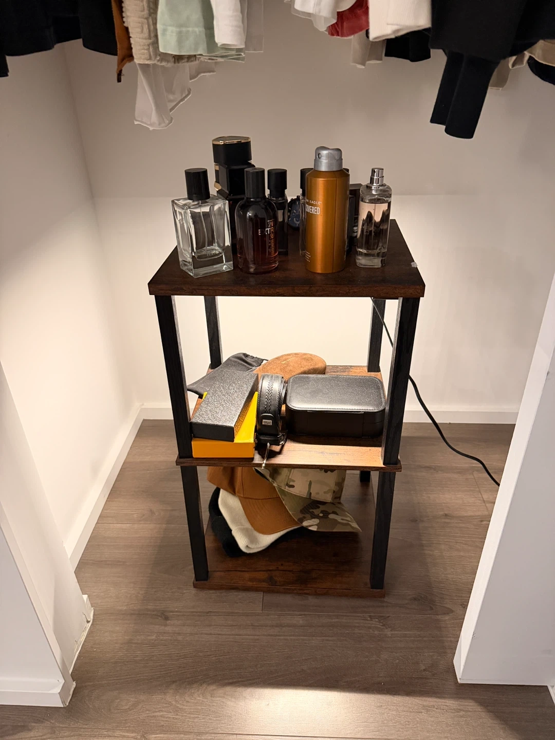 60Selling a handy 3-tier wooden shelf! It's perfect for organizing items in a closet or displaying decorative pieces. The shelf has a sturdy frame and a warm brown finish. It could be a great addition to any room!