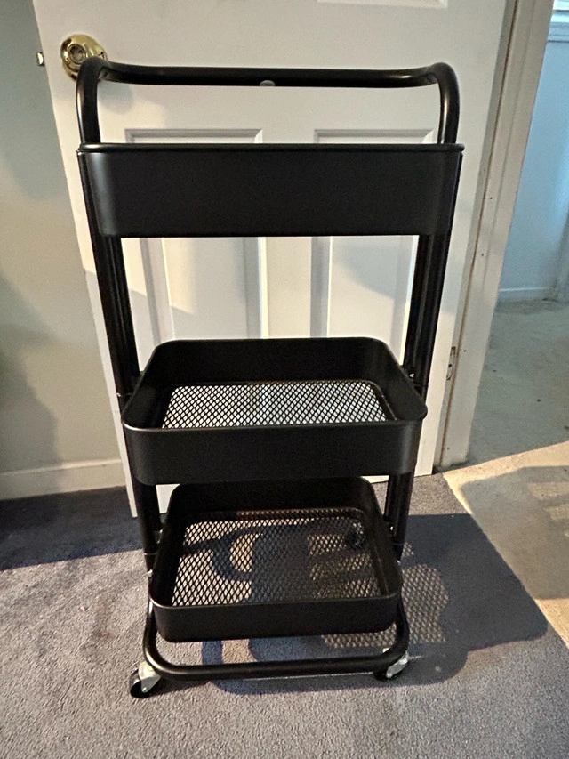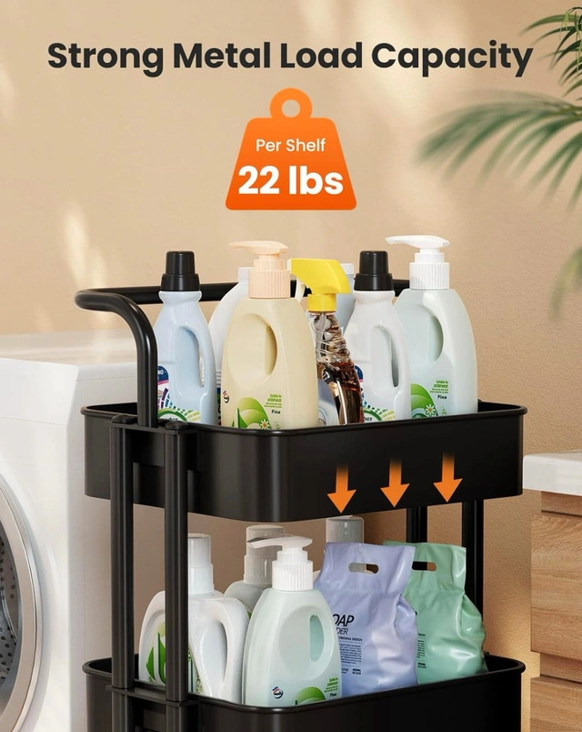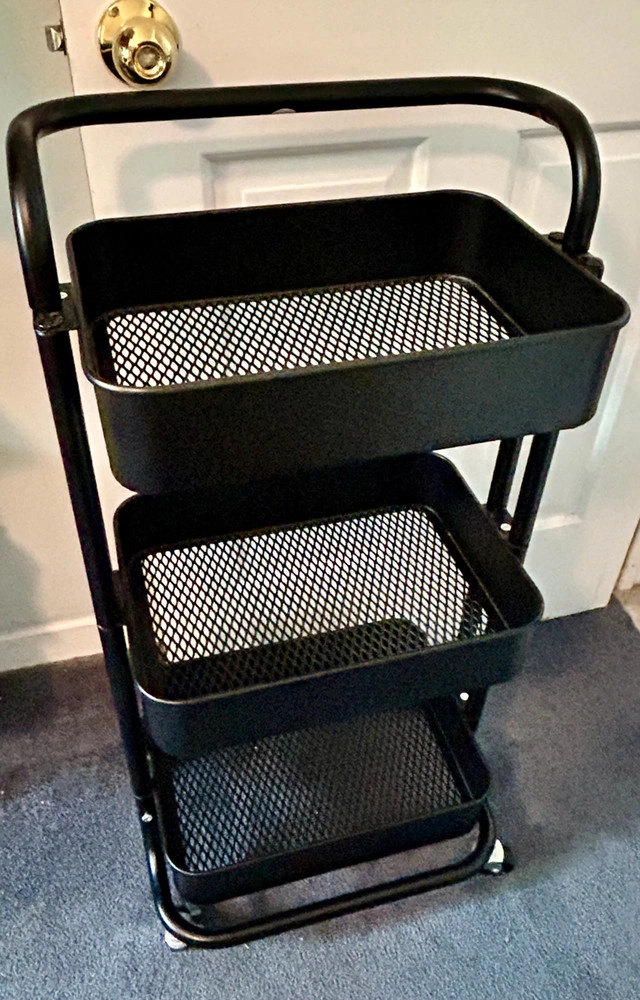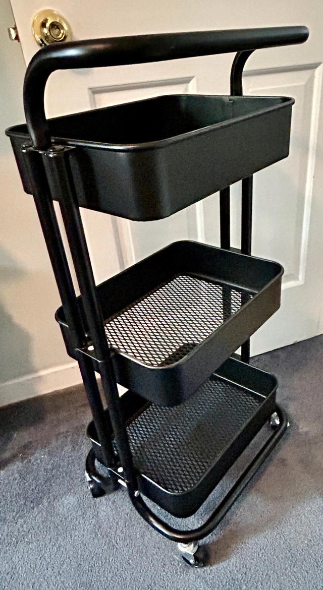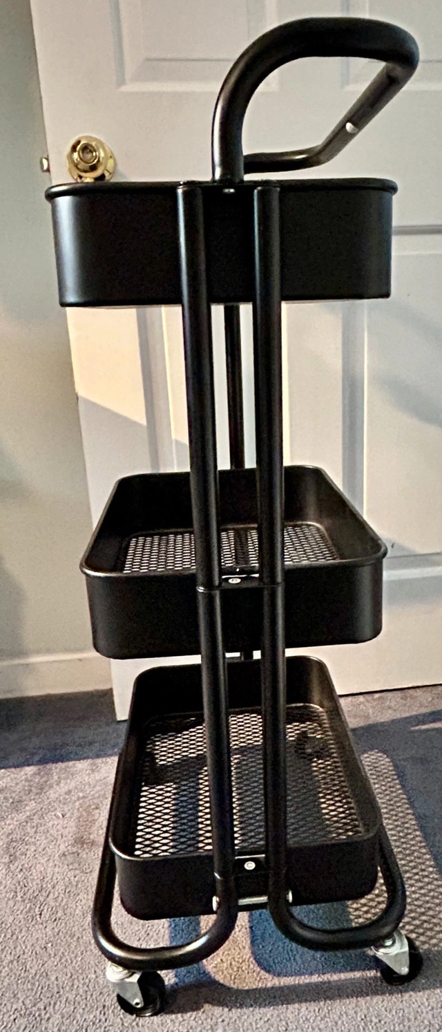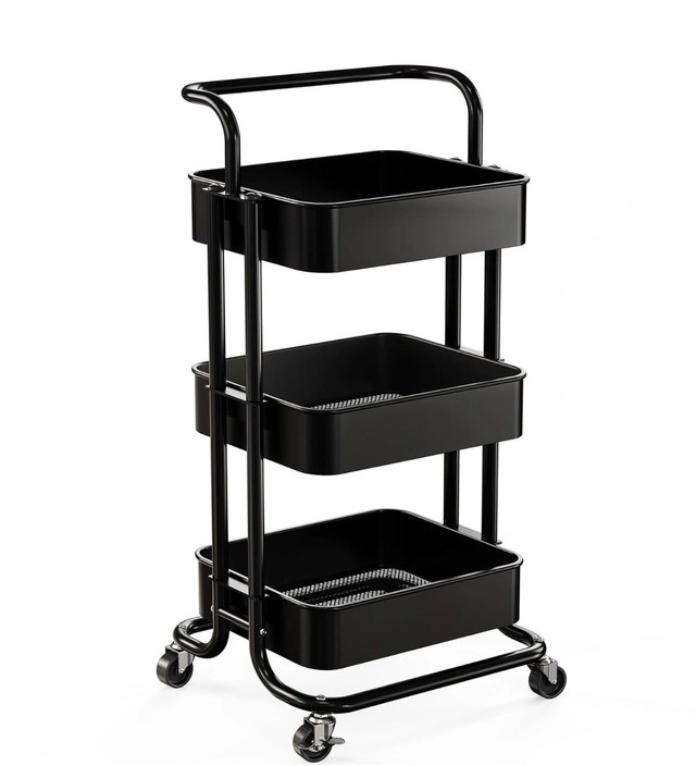 3 Tier Mesh Utility Cart Rolling Metal Organization Cart with Handle and Lockable Wheels Multifunctional Storage Shelves for Kitchen Living Room Office Company Make: Pipishell Colour: Black Payment: Cashless payment, Cash accepted