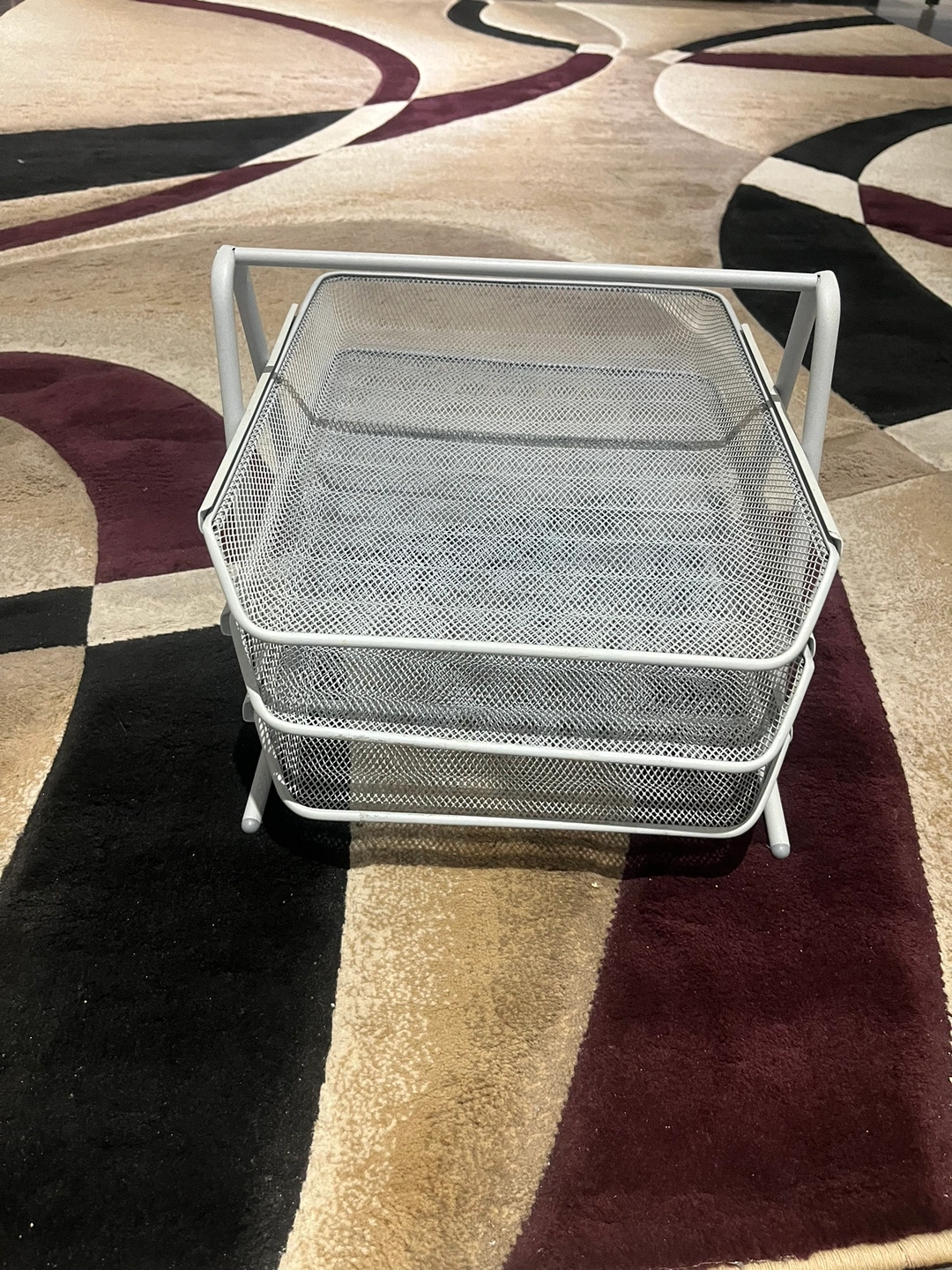 87Three tier metal wire pullout desk organizer with a carrying handle. Great for organizing and storing papers.