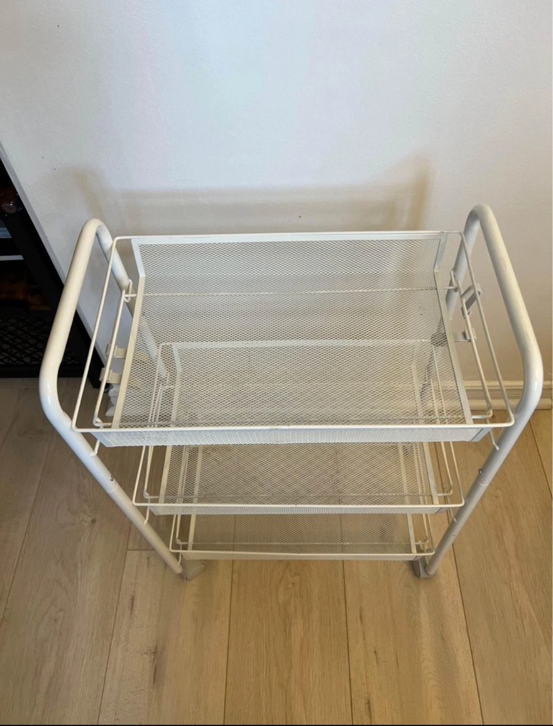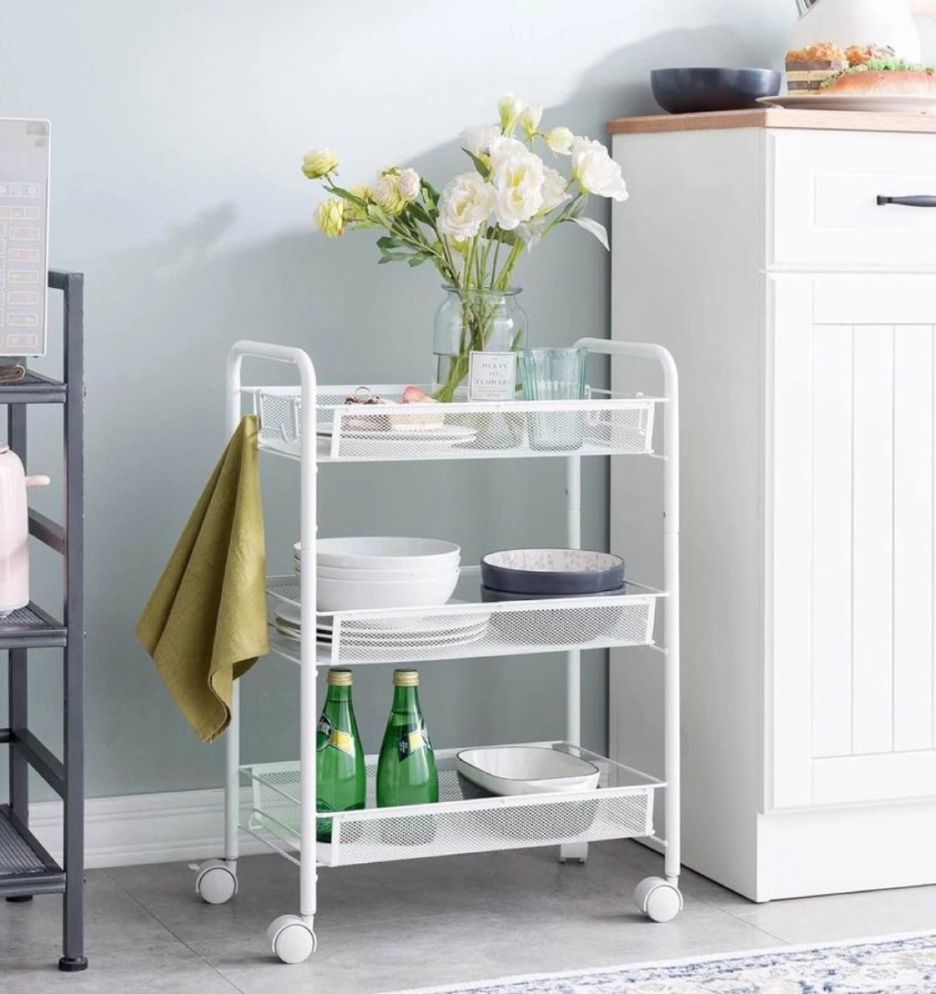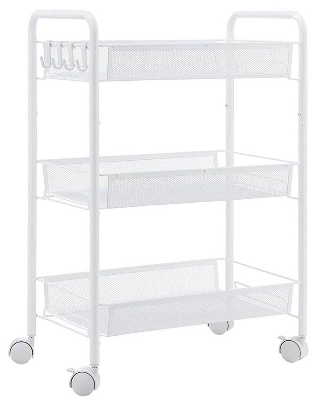 White metal rolling cart with 3 wire shelves and locking wheels. Great for kitchen storage and organization. 3-Tier Rolling Utility Storage Rack Cart on Wheels, Trolley Craft cart, Multi-Purpose Organizer Shelf