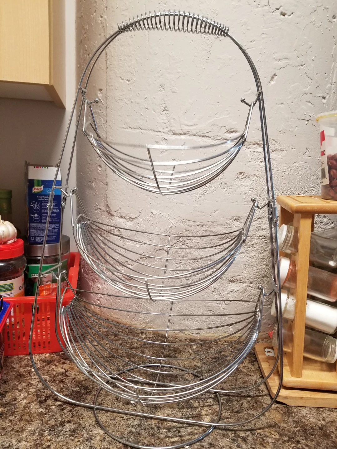 15Declutter your counter with this handy 3-tier wire fruit basket stand! Perfect for storing fruits, vegetables, or even snacks. It's in great shape and ready to add a touch of organization to your kitchen
