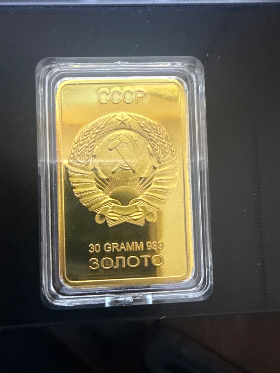 Selling a 30 gram gold bar. It appears to be in good condition and comes in a protective case. The bar features a CCCP emblem on one side and a Russian emblem on the other