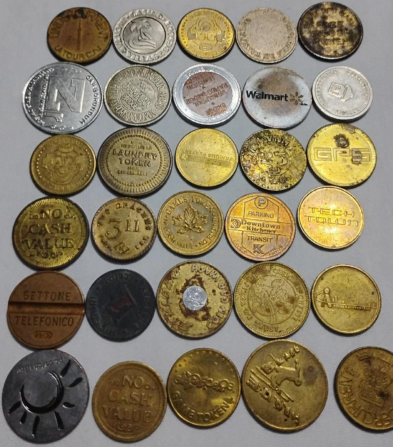A collection of various tokens, including laundry tokens, parking tokens, and promotional tokens from different businesses and locations