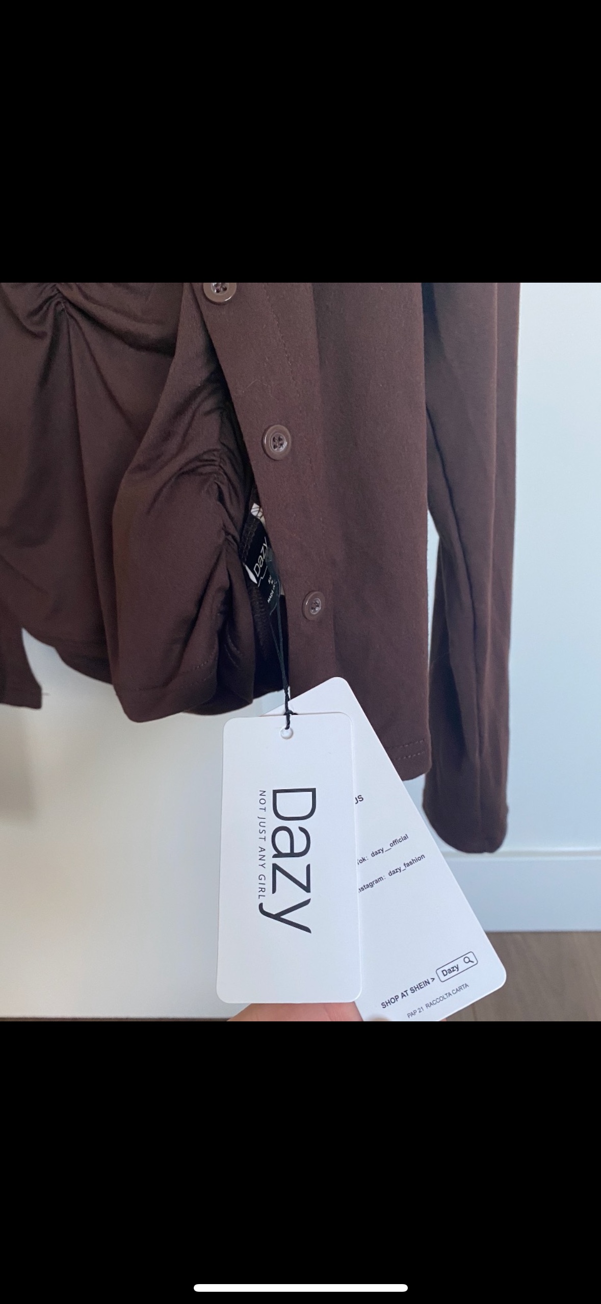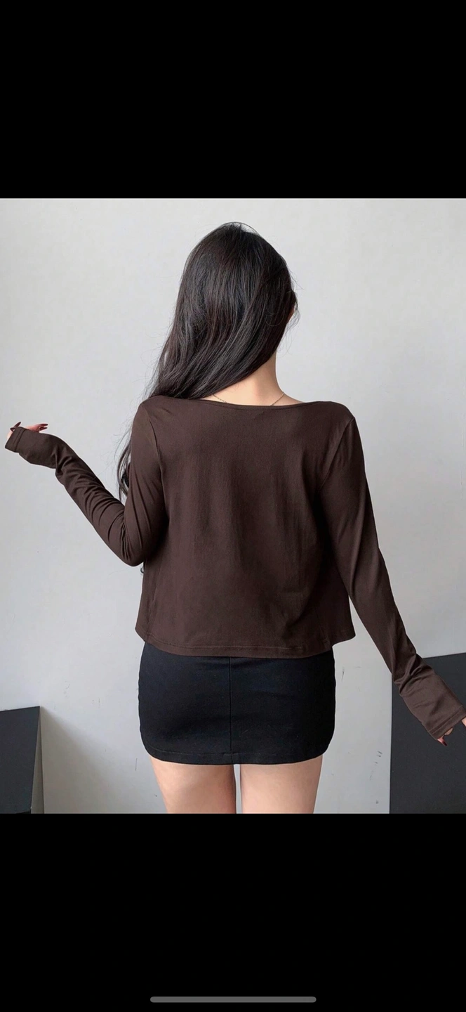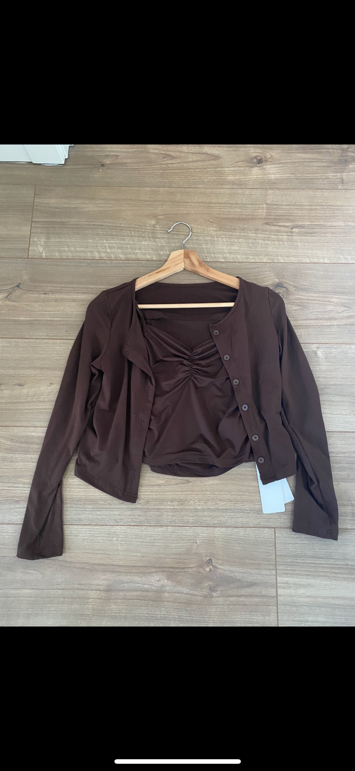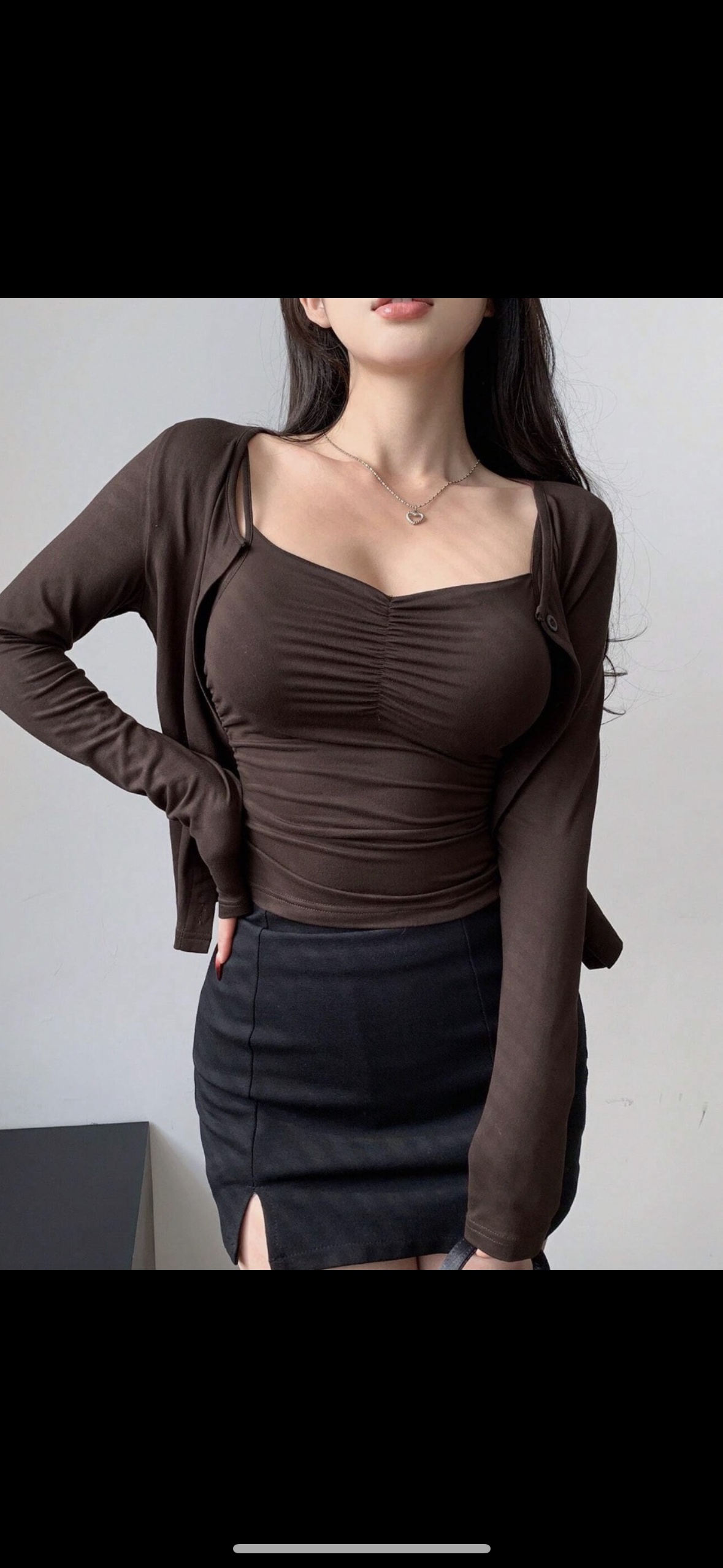 This set includes a long-sleeved cardigan with buttons and a sleeveless crop top. Both pieces are a brown colour.