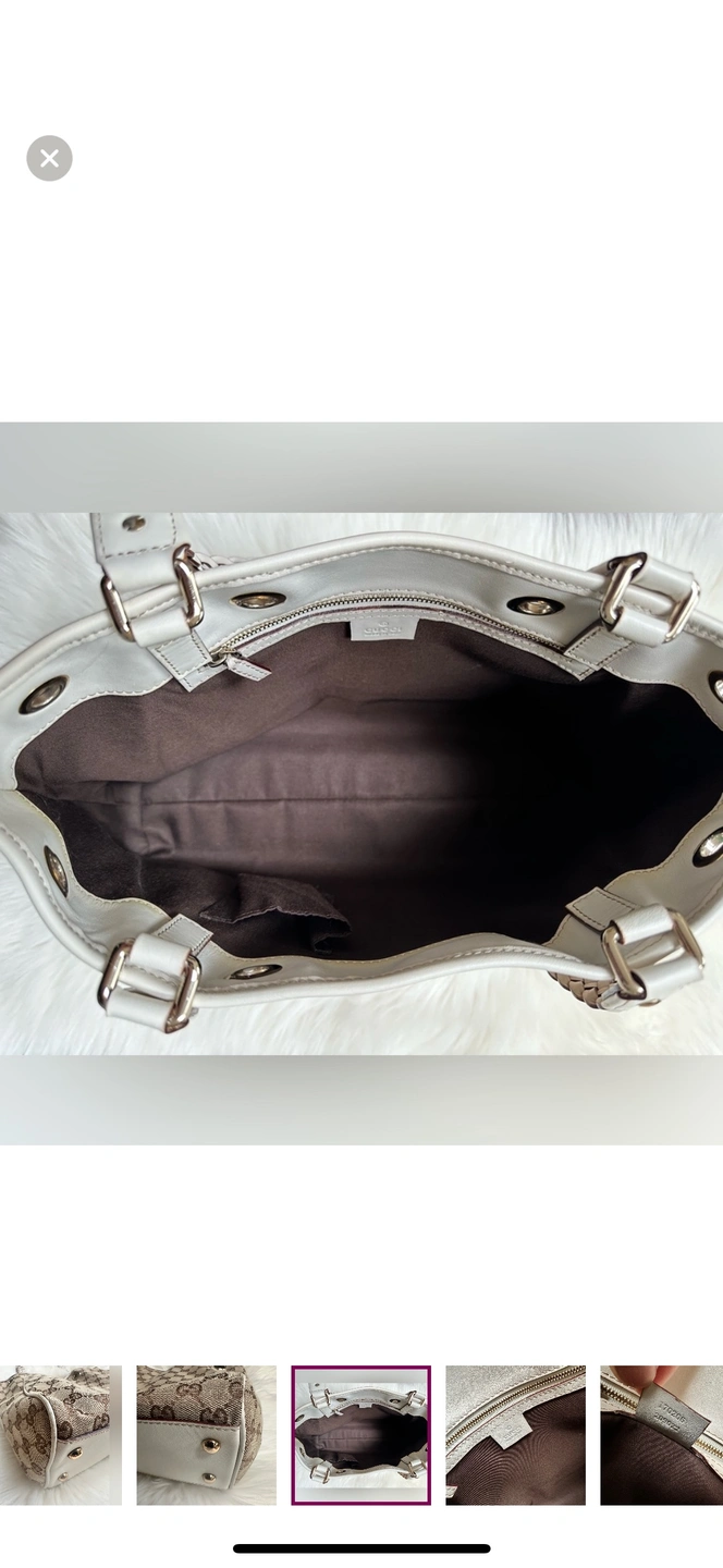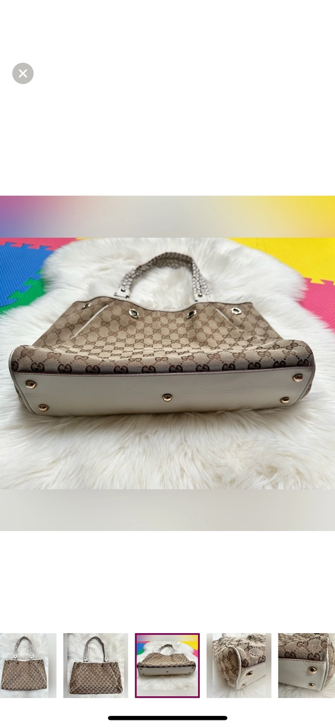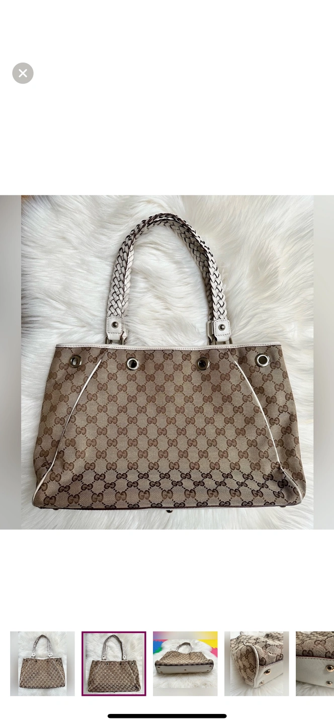 This is a classic Gucci tote bag with braided leather handles and a GG canvas body. The bag features a top zipper closure and a spacious interior. It is perfect for everyday use or for special occasions.