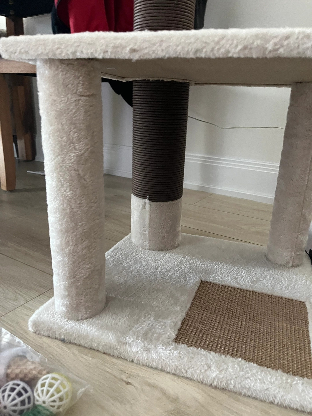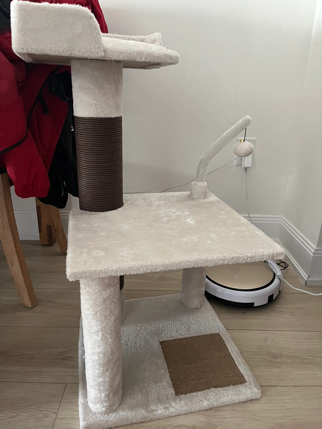 This is a two-level cat tree with a scratching post, a platform, and a dangling toy. Used like once and then ignored.
