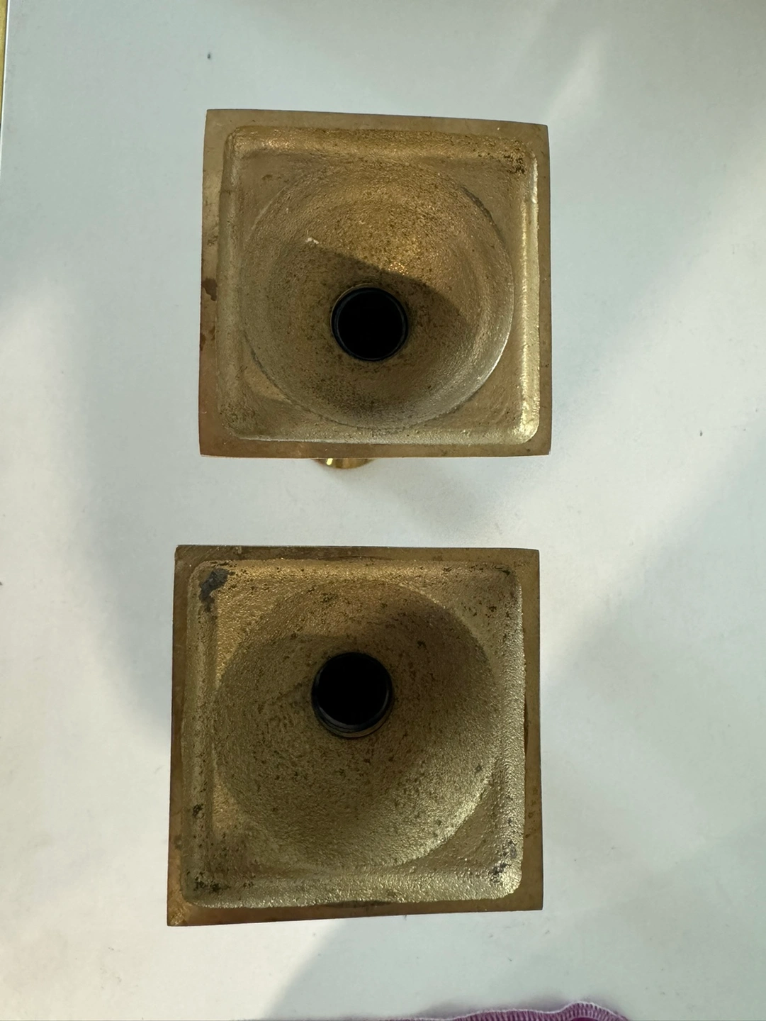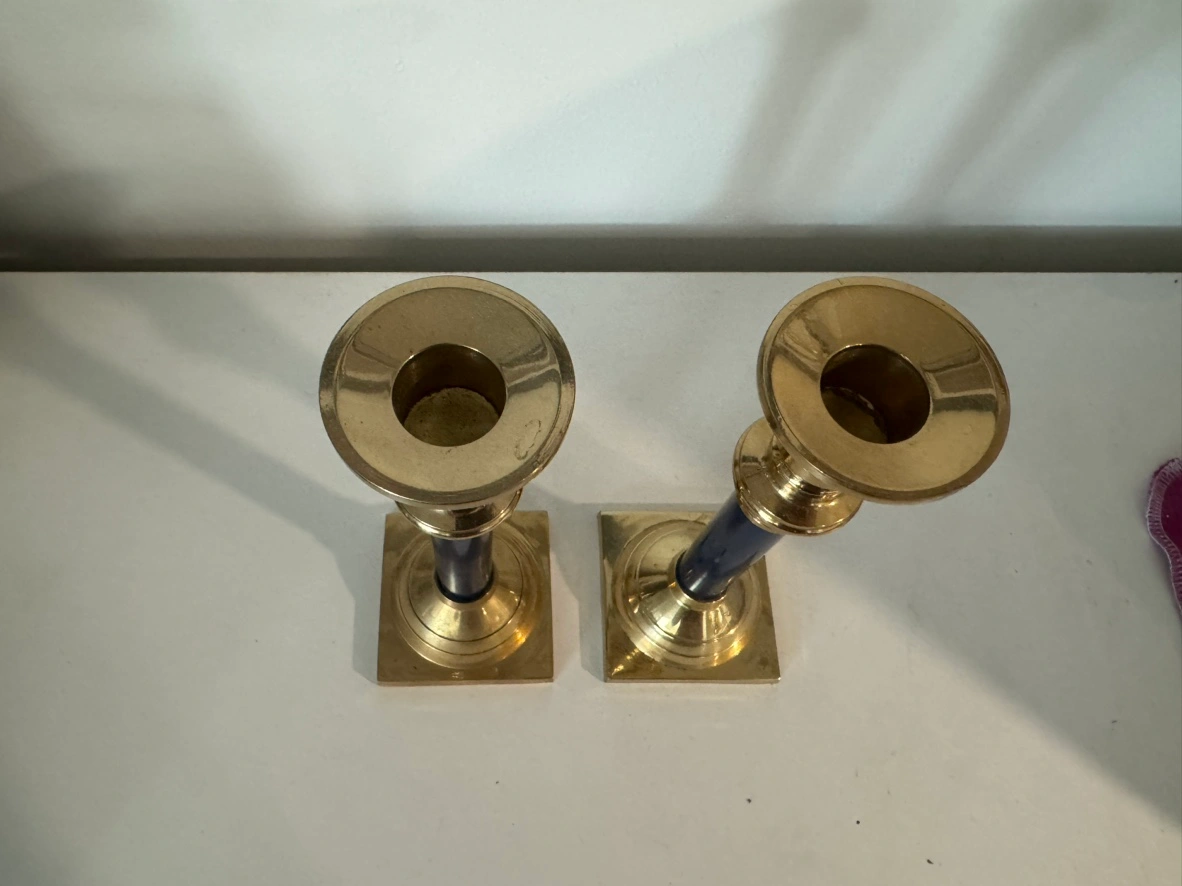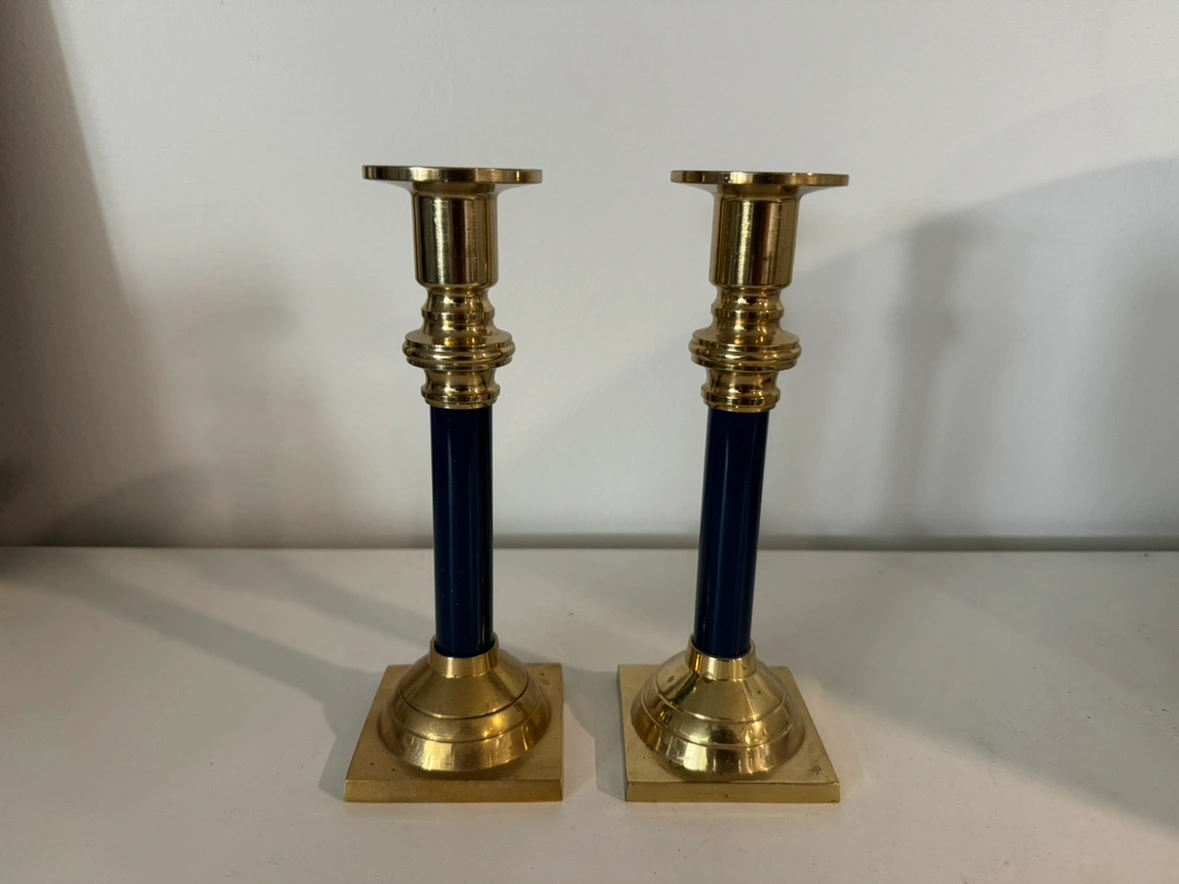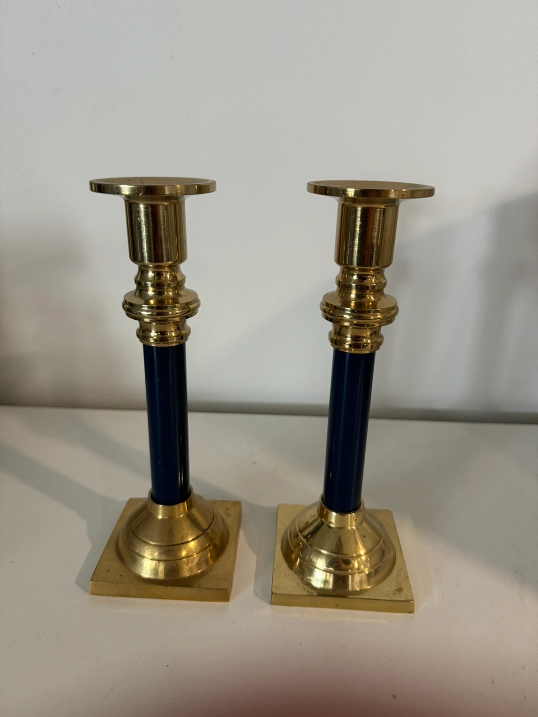 382Set of two brass candle holders with a blue base. They are in good condition.