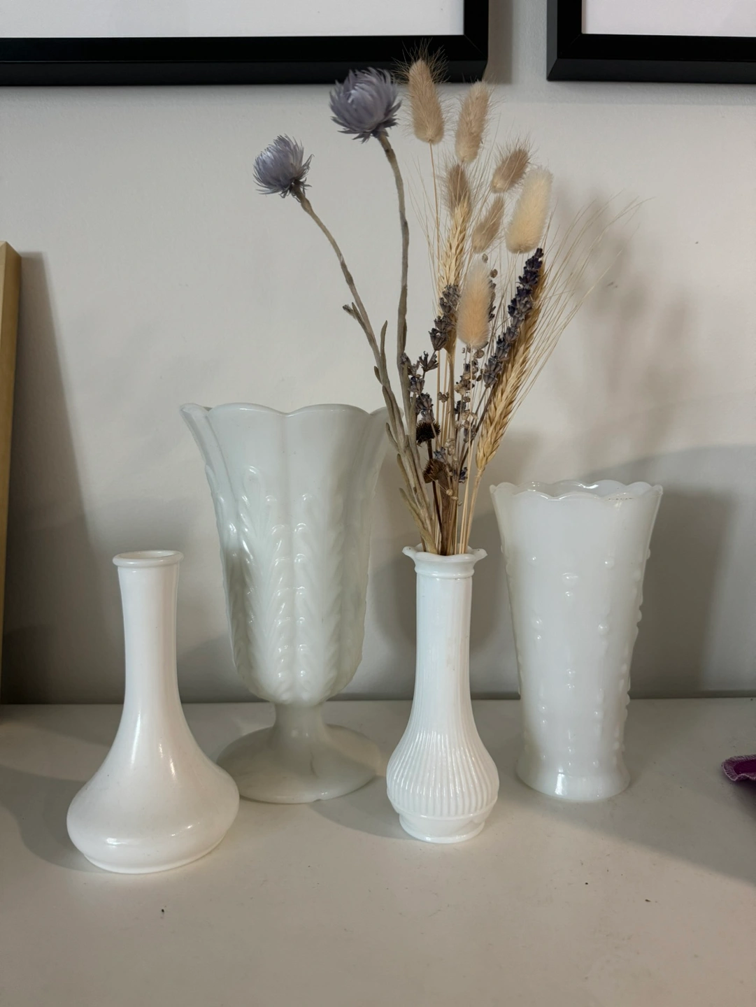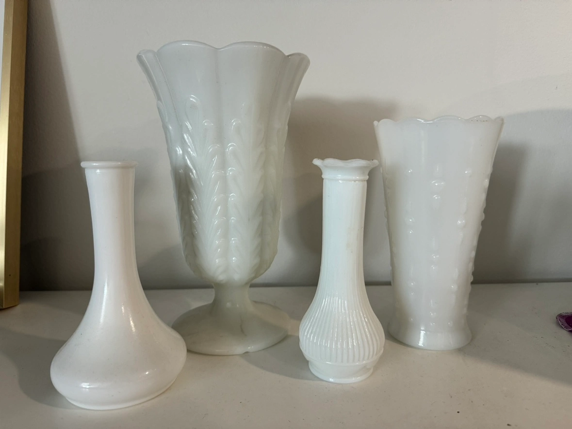 382Four milk glass vases in various sizes and patterns. Dried Flowers not included