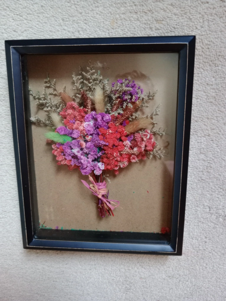 This is a lovely framed piece of dried flowers. It is a great way to add a touch of nature to your home. The frame is black and the flowers are a beautiful array of colours.