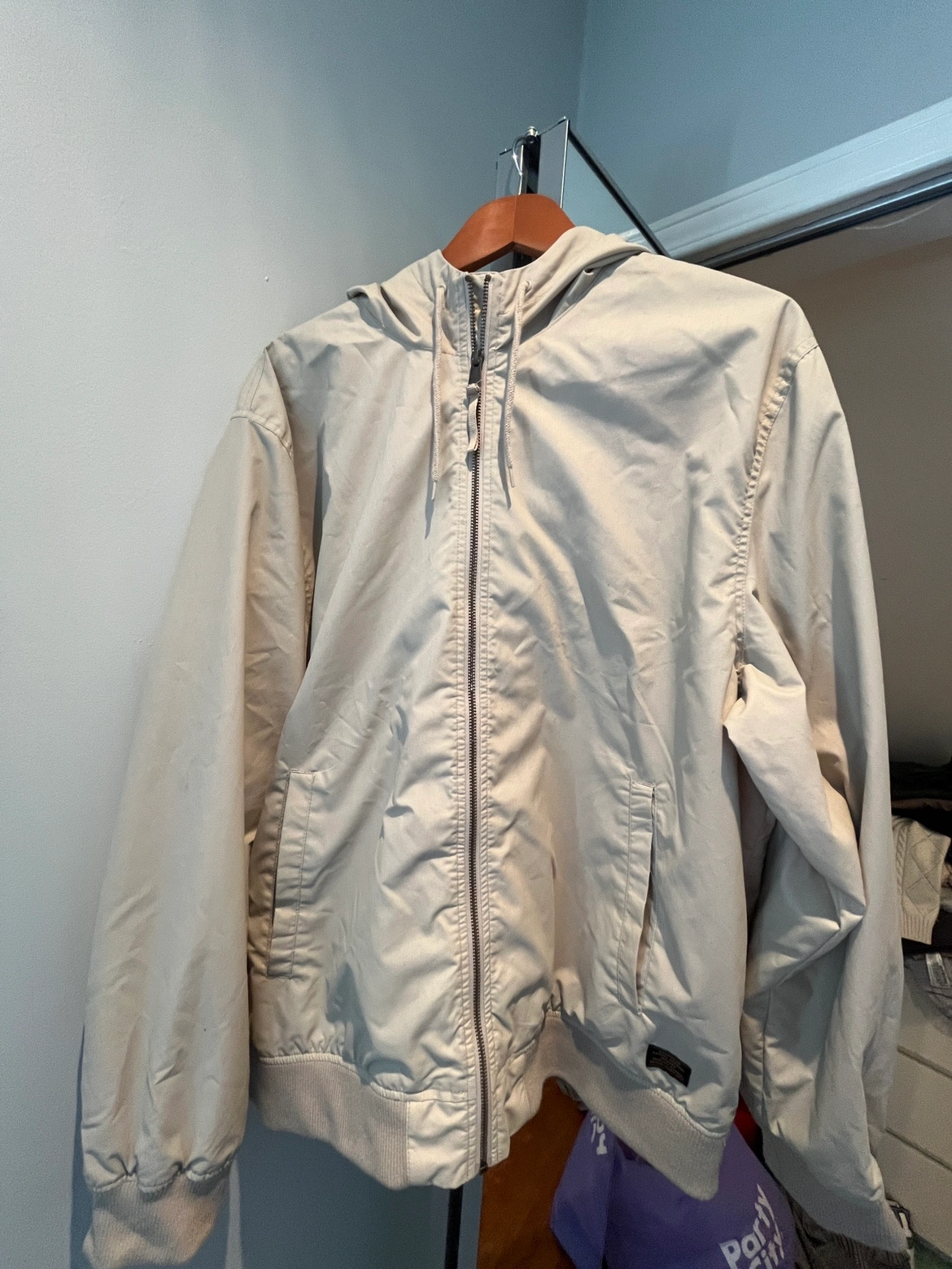 A beige jacket with a zipper closure and a hood. It has a relaxed fit. The jacket is in good condition. Pick up only near Main St & Kingston Rd (apartment). If you’re interested, let me know what day and time you can come. Please don’t ask if it’s available — if the listing is up, it’s still available.