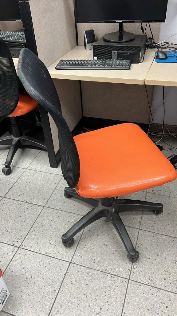 Orange faux leather seat and black office chair with mesh back. The seat is adjustable and has five wheels. The chair swivels. Comfortable and ergonomic design. The chair is perfect for the office, home or study.