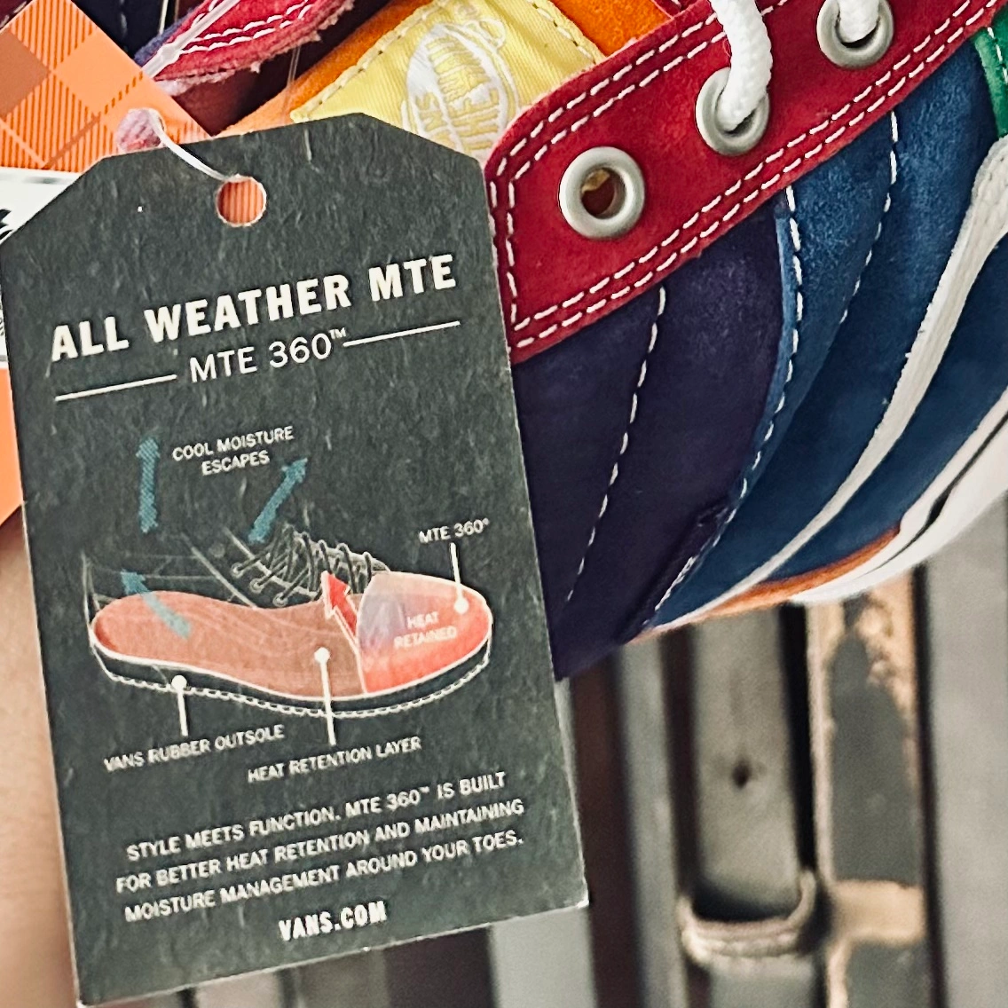 These are Vans MTE all weather high top shoes in size US Men's 9 or Wm 10.5 featuring a rainbow colour scheme in Suede.