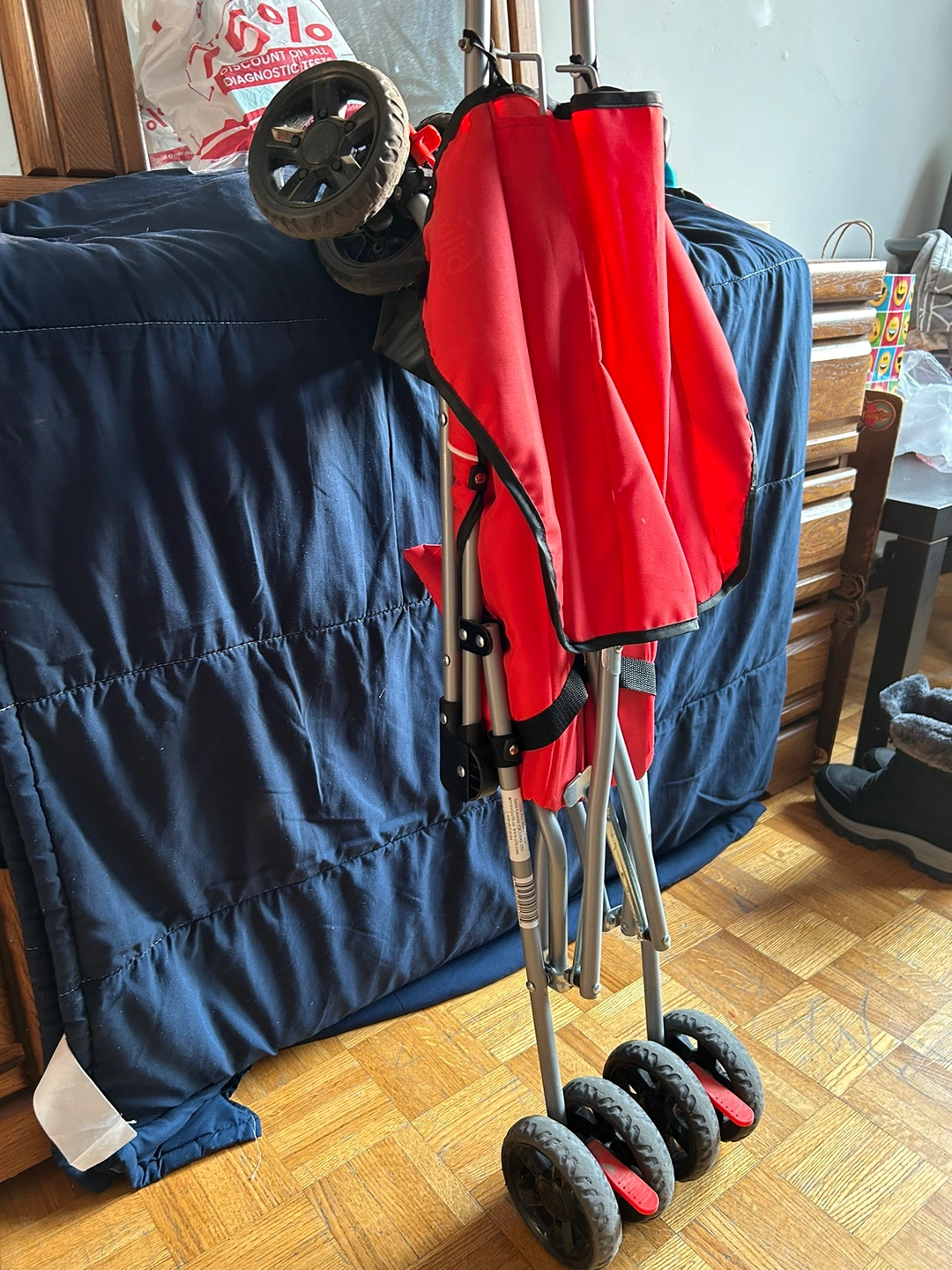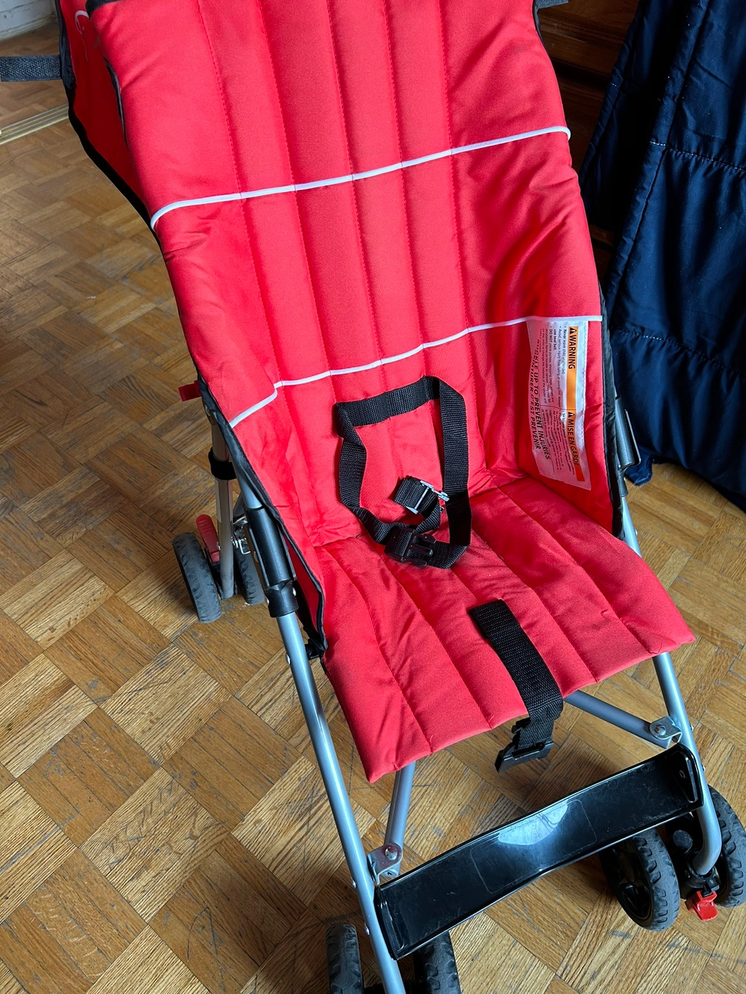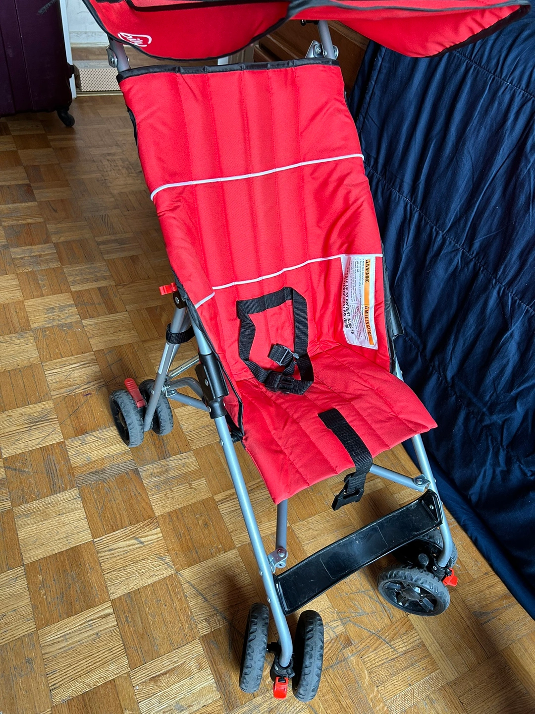 This stroller folds easily for compact storage. It is made of a durable, lightweight aluminum frame. It has a canopy for sun protection, and a 5-point safety harness.