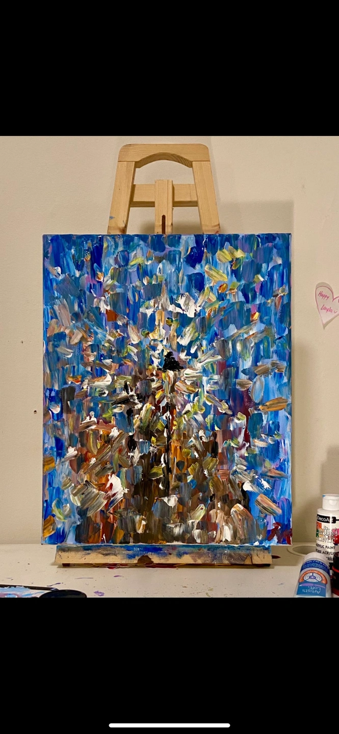 This painting is on canvas and is ready to be hung on a wall. It has an interesting texture and is a great piece for a modern home. Based on rainy evening in quiet city centre. Original and unique. Can be signed