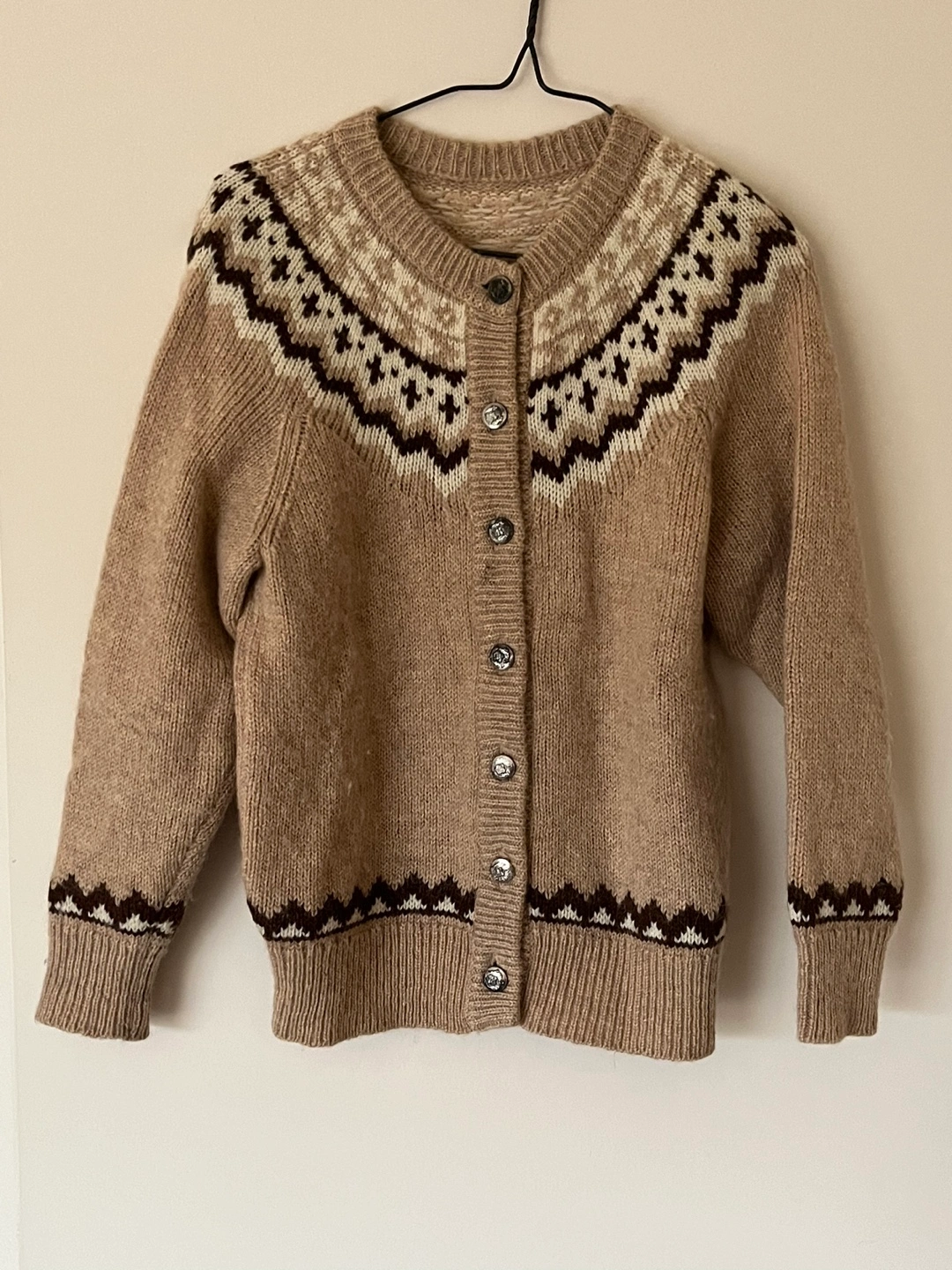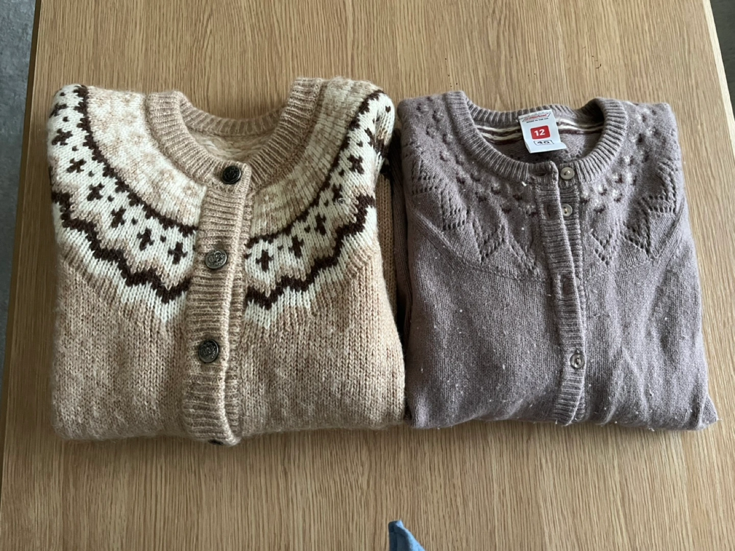 1. Brown cardigan with a button up front, long sleeves and a beaded design around the neckline. St Michael brand. Made in the UK. 2. Light brown cardigan with nice pattern around neckline. Unknown brand.