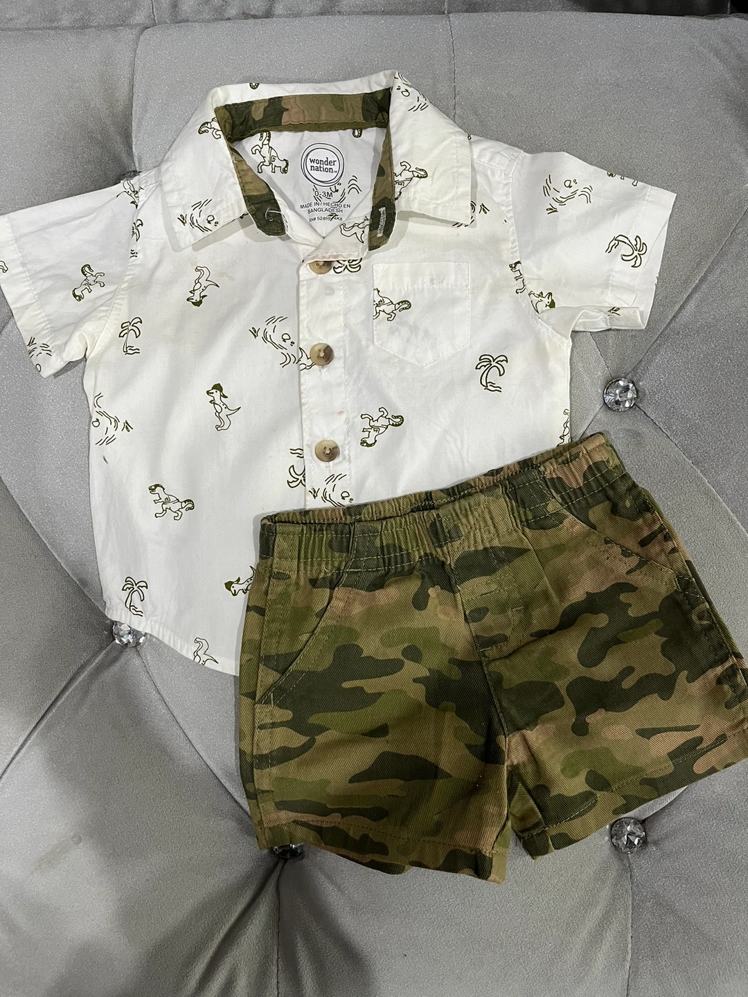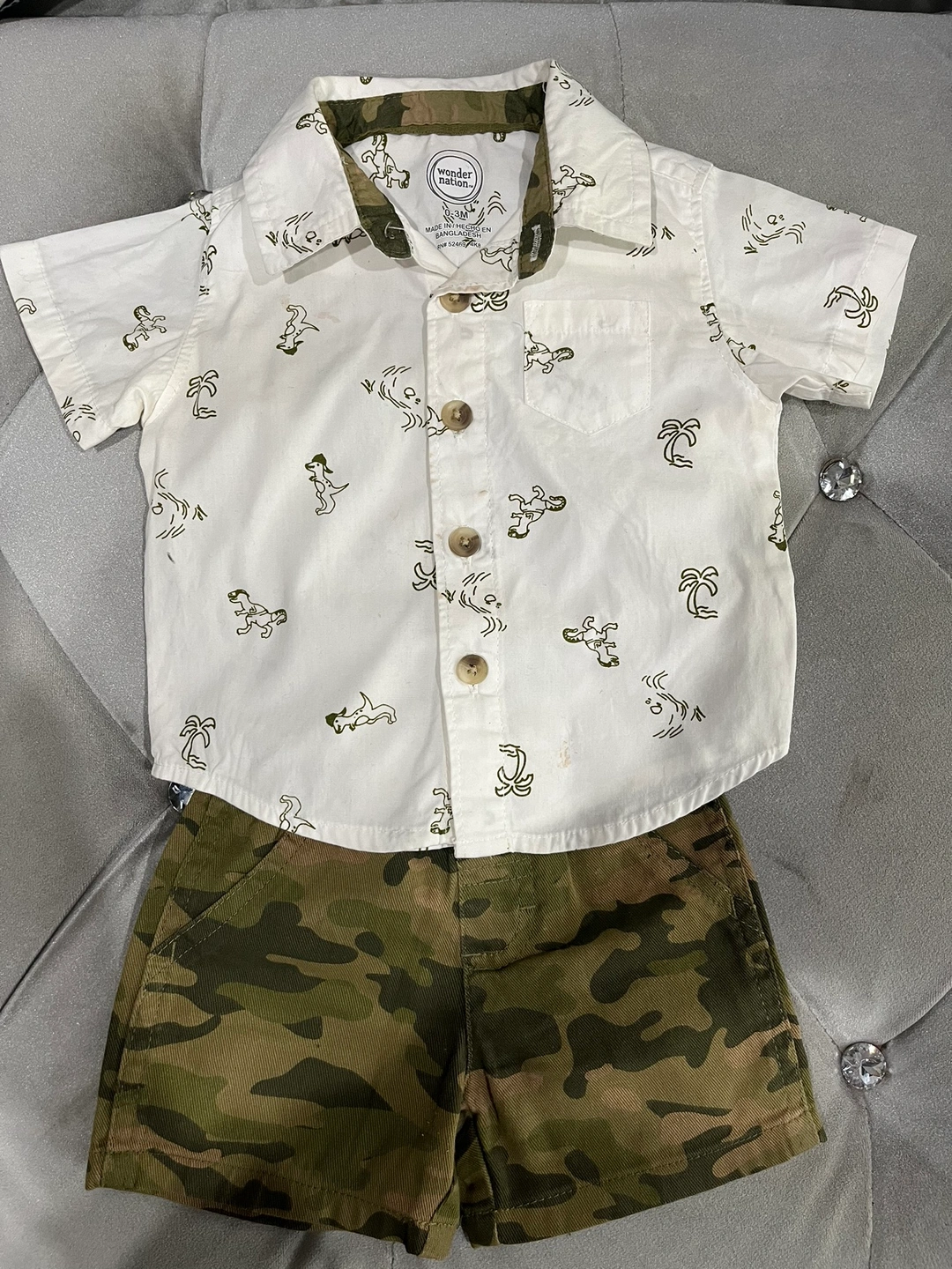 This is a 2 piece baby boy outfit from Wonder Nation. The shirt is white with a short sleeve and button up closure. It has a pattern of small dinosaurs and palm trees. The shorts are camo with a brown elastic waistband.size is 0-3 months.