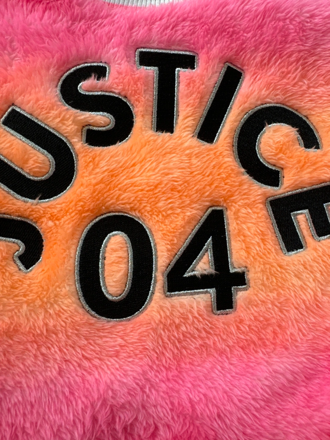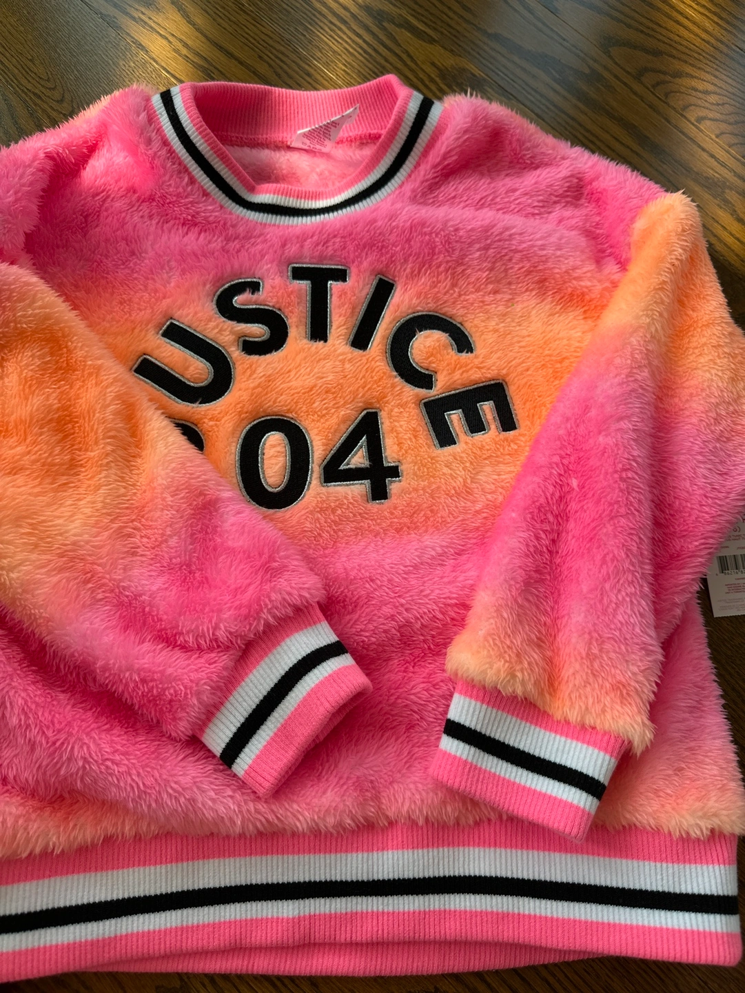 Justice pink tie-dye sweater with black and white stripes. It has a Justice 04 logo on the front.size 5 to 6