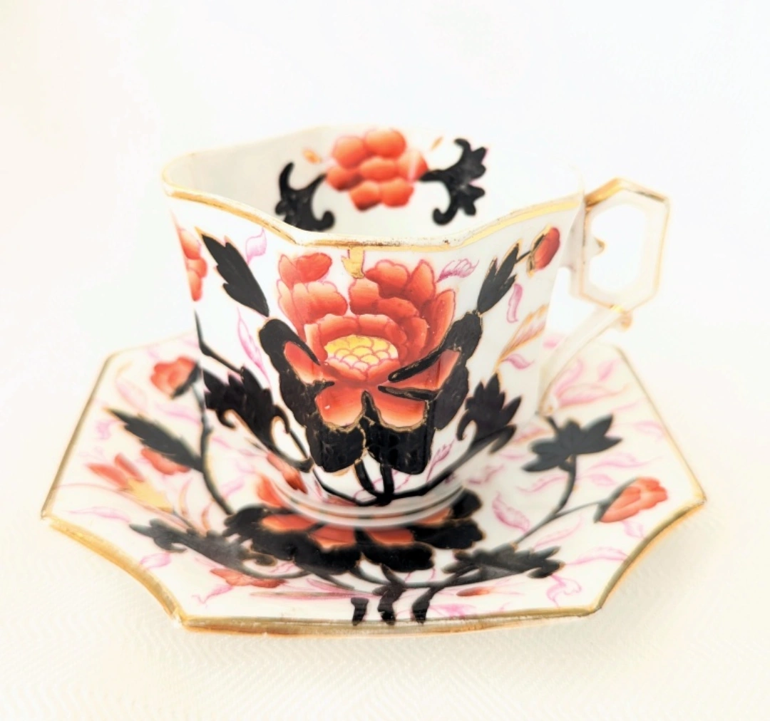 Antique teacup and saucer set in the style of Japanese Imari porcelain. It features a beautiful floral pattern where the saucer and teacup are both octagonal in shape. The teacup has a delicate handle with gold trim. The saucer also has gold trim. Some wear to gold, but no chips, cracks, or crazing.