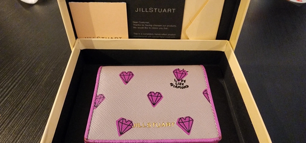 A purple JILL STUART card holder with a Love Like Diamond pattern.