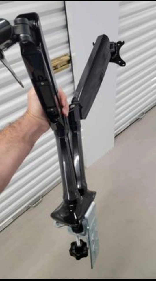 This is a black monitor desk mount with a clamp. It is in good condition and has been used.
