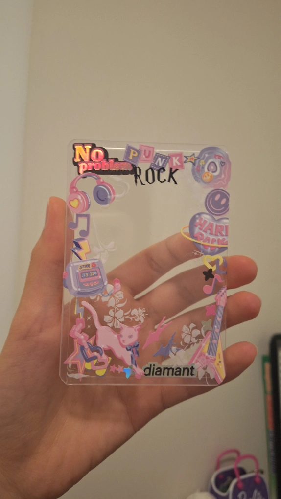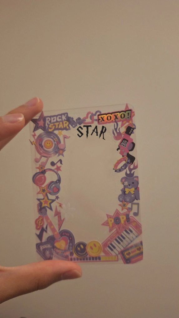 Cute, clear case with a variety of stickers on it. The case is made of clear plastic and has a variety of stickers on it, including stars, hearts, and musical notes. You can put catd in it
