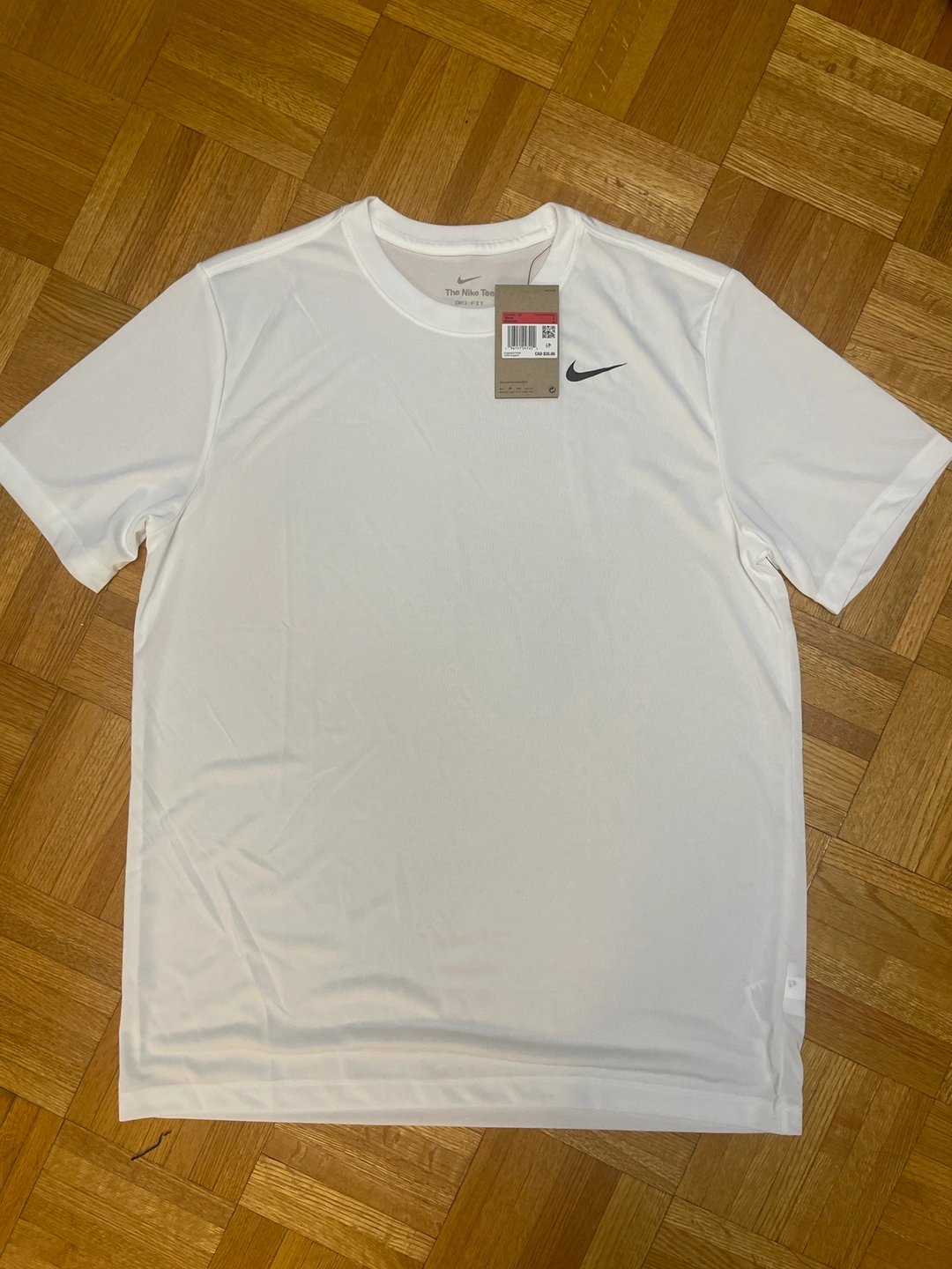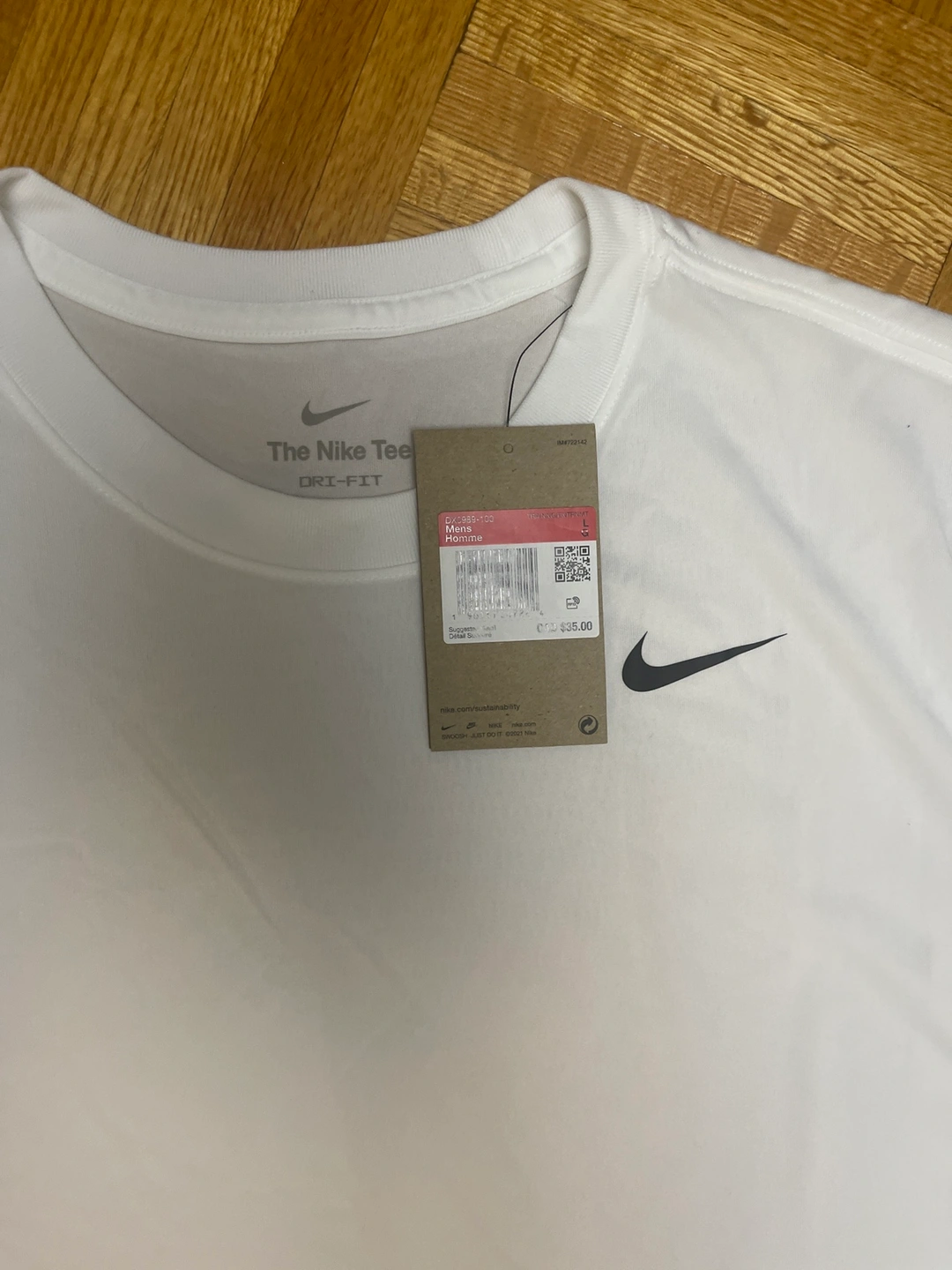 White Nike Dri-FIT T-shirt with black logo. The shirt is new with tags. It is size Large. It is made of 100% polyester. It is in a standard fit. It has a tag reading "Nike Dri-FIT". The shirt is designed to wick moisture away from the skin and keep you cool and dry. It is a great option for working out or running errands.