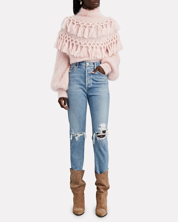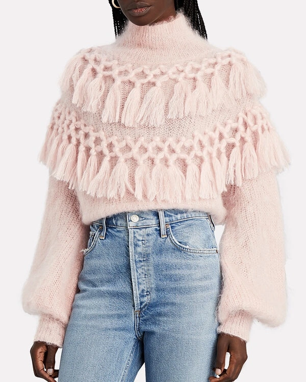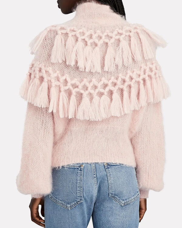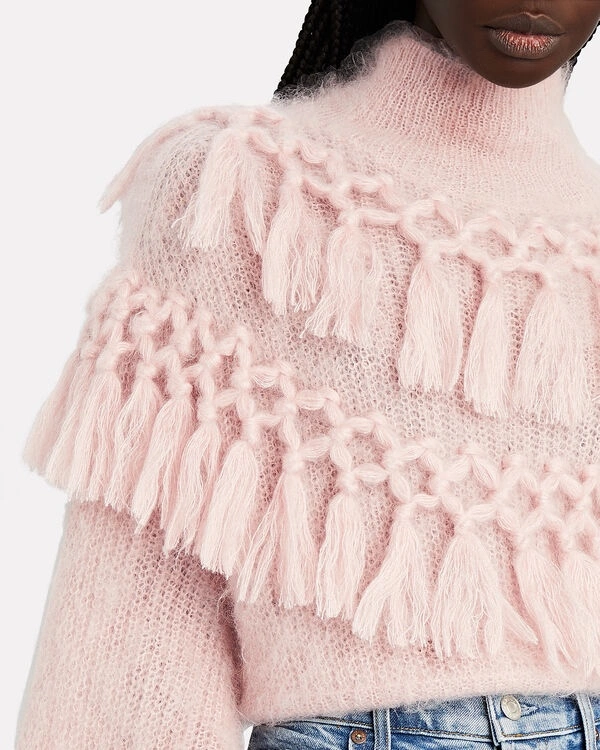 This pink sweater features a high neck, long sleeves, and a fringe trim. It is made of silk and mohair.