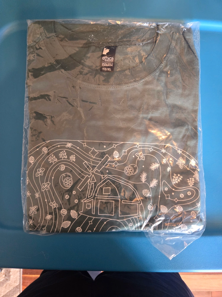 This is a green t-shirt with a white design on it. It has a tag that says "Ethica Apparel" and "Made in Canada." The size is T/G/XL. It is in a plastic bag.