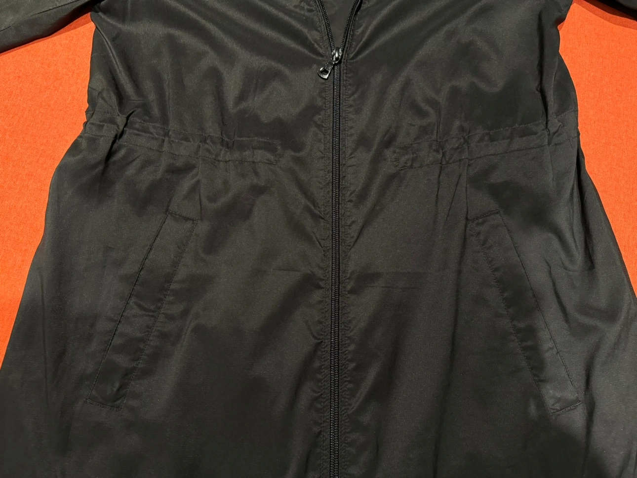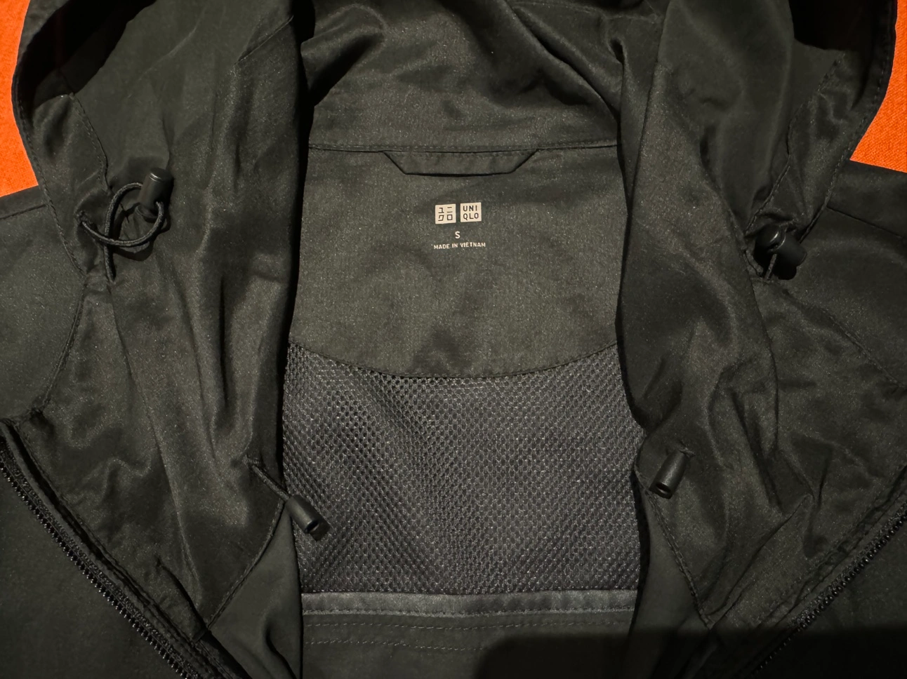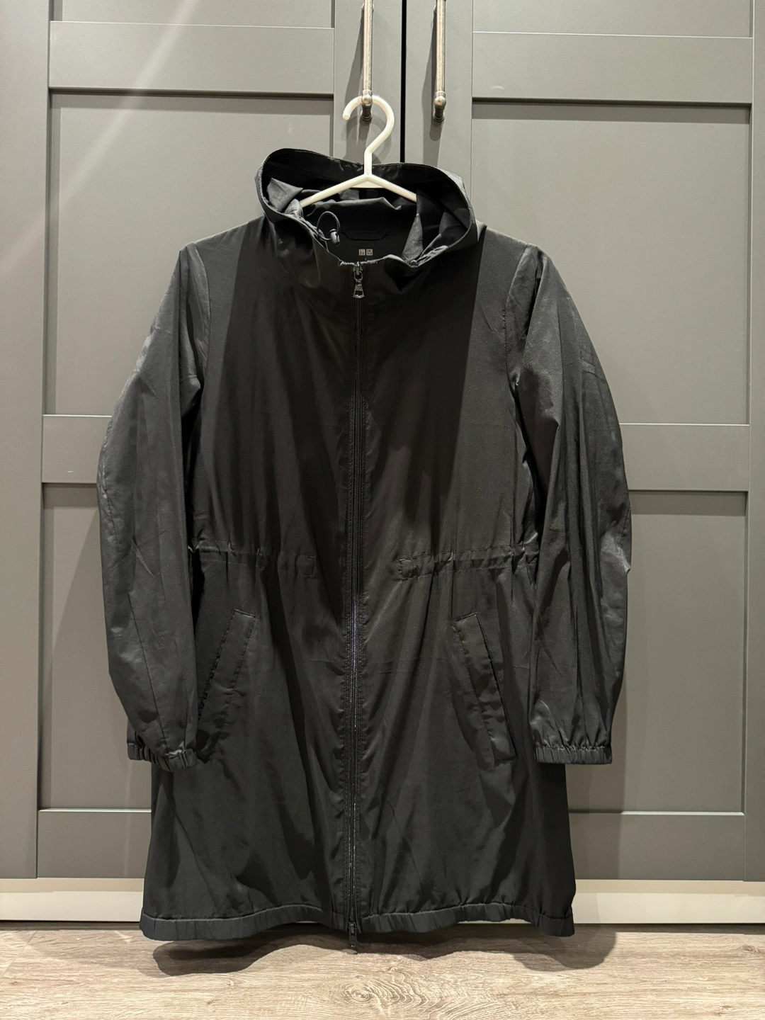 Uniqlo Black hooded jacket, size small, with a zipper closure. With adjustable bungee cord at hood, waist and bottom. Bought from Japan.