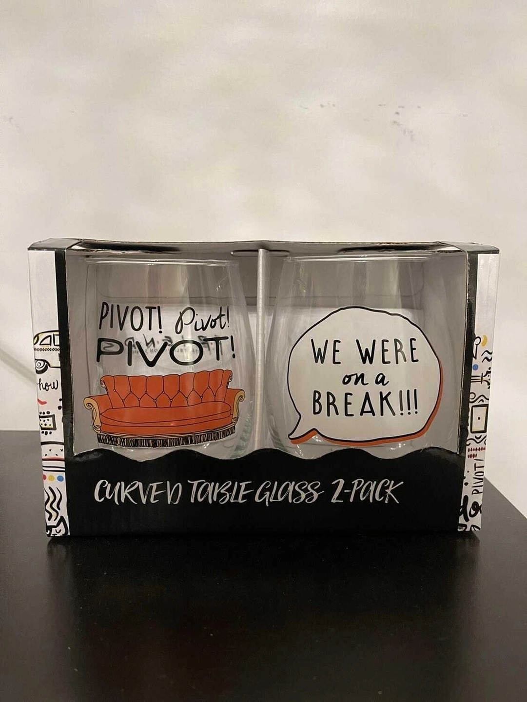 65Set of two curved stemless wine glasses with a "Pivot" design on one and a "We were on a Break!" design on the other.