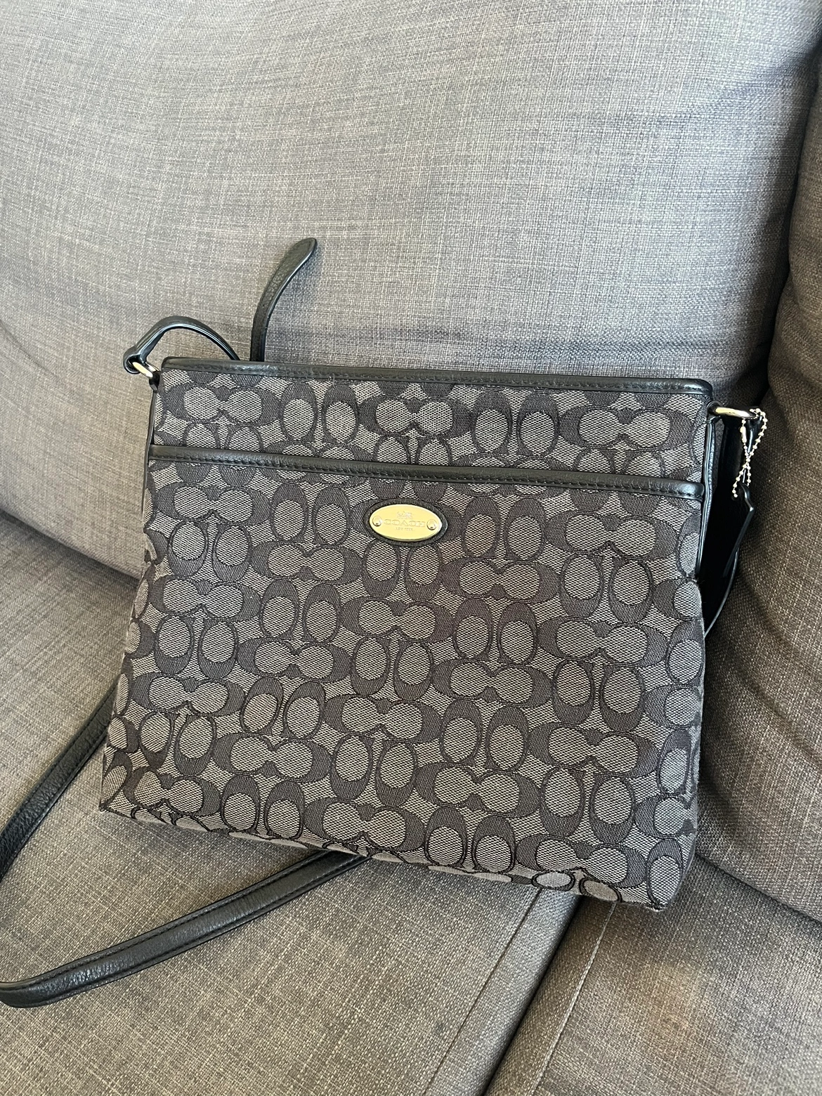 Black and grey Coach signature print crossbody bag with adjustable strap. This bag is perfect for everyday use. Pick up in downtown