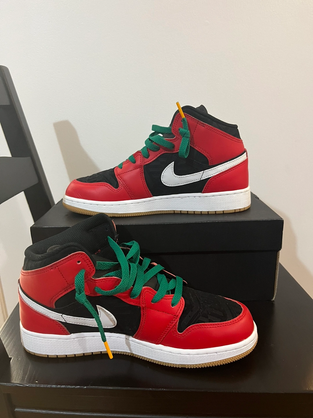 •(gently-used) Air Jordan 1 Mid SE (GS) Black/Fire Red-White-Malachite colour