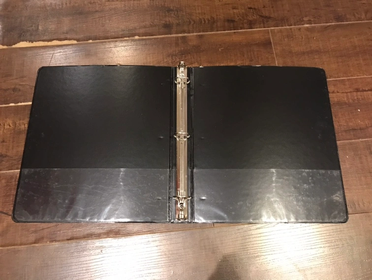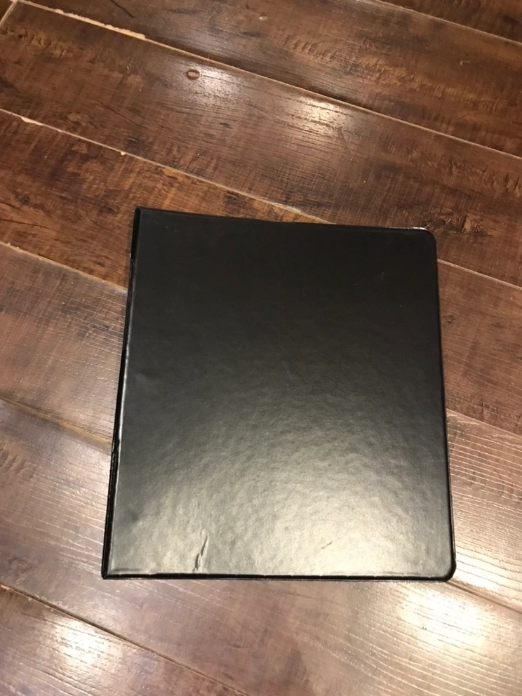 A black 1 inch binder with three rings. The binder has a clear plastic cover on the front and back.