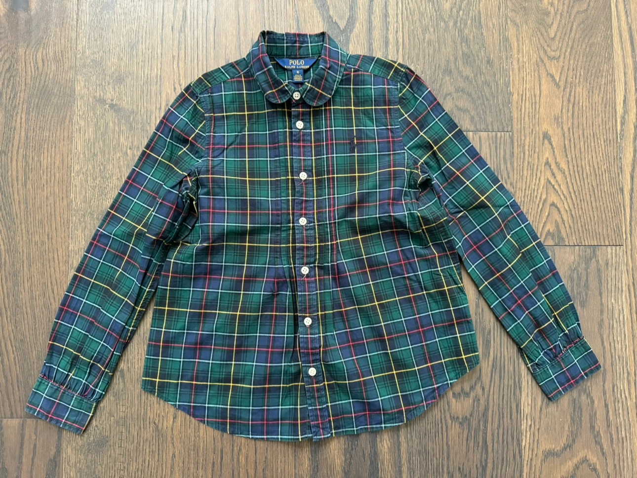 RL Girls green plaid with red, yellow, and navy blue. Long sleeves with a button-down collar.