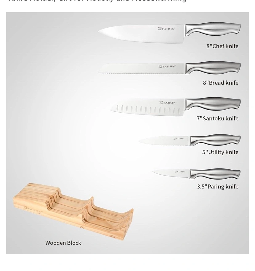 A 6-piece knife set with a wooden block. The set includes a chef knife, bread knife, Santoku knife, utility knife, and paring knife. New Price 55$ Pick up north York