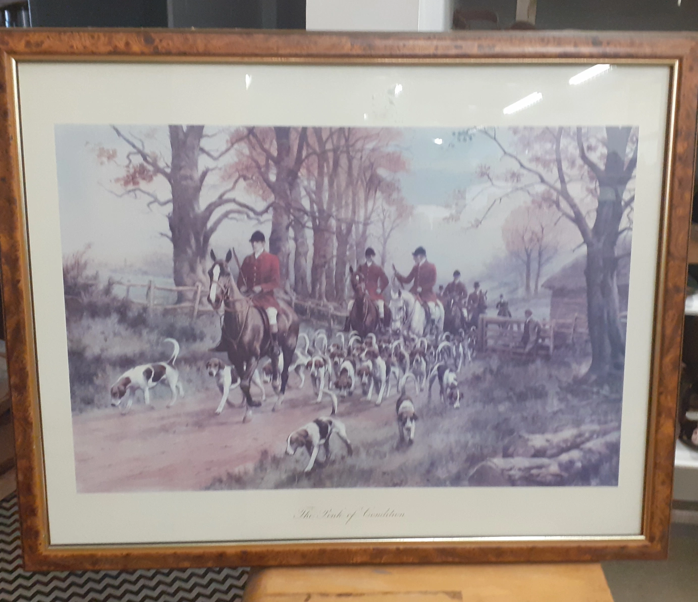 A framed print of "The Pack of Foxhounds". The print is in a wooden frame with a gold finish.