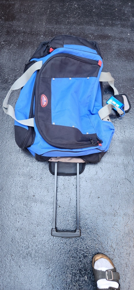 This is a rolling duffle bag. It is blue, black, and grey with a retractable handle. It has a zippered pocket on the front and a large main compartment.